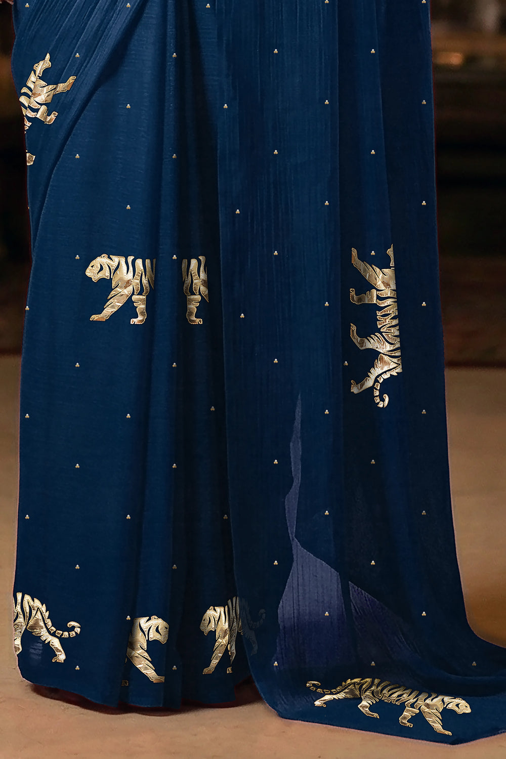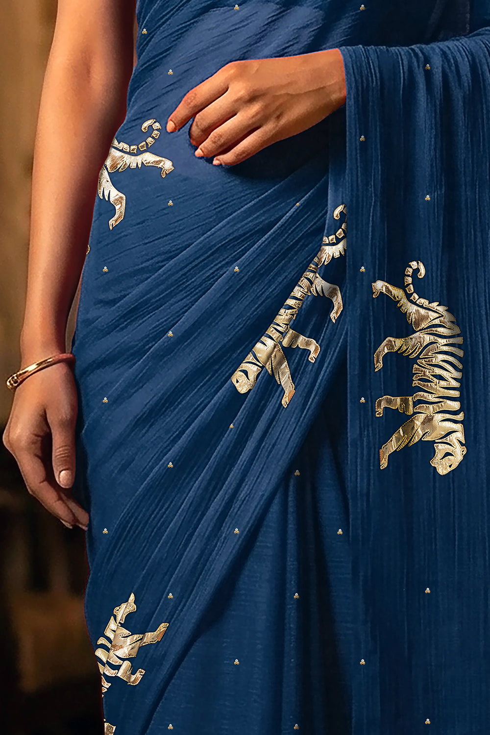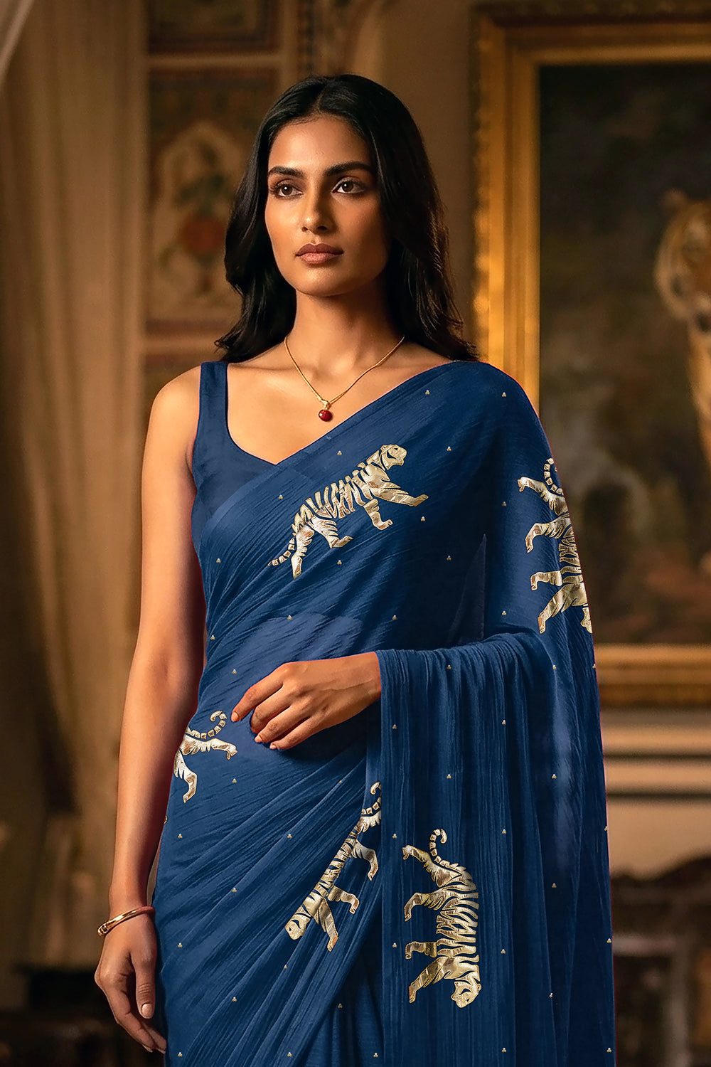 Commanding attention in a rich Spring Green, Baghini is a masterpiece woven in Pure Mulberry Silk Chiffon, exuding both strength and sophistication. The saree comes alive with handcrafted tiger motifs, delicately rendered in shimmering Gota and Zardosi work, symbolizing the spirit of fearless femininity.