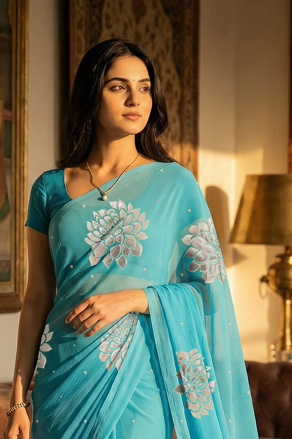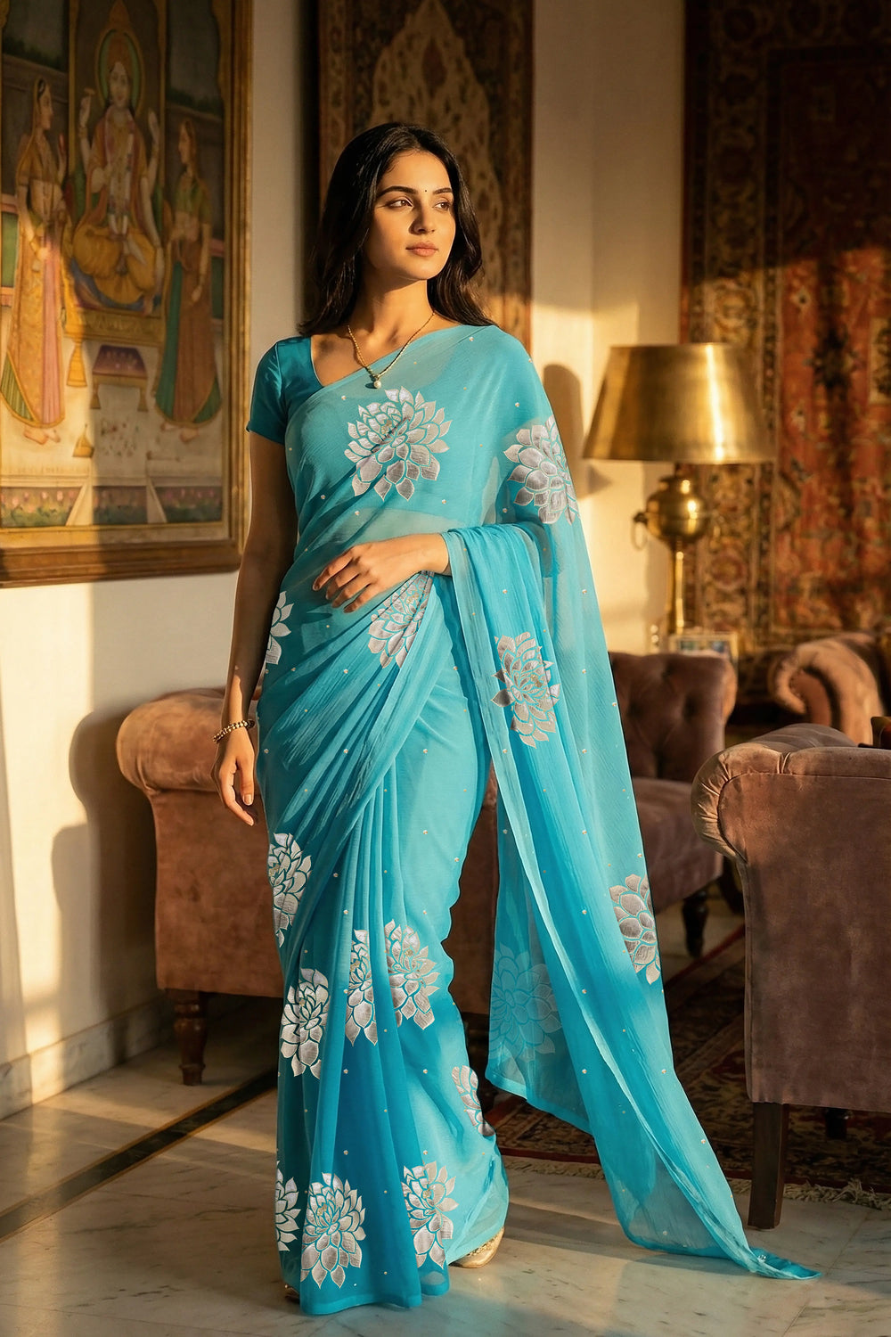 An Indian woman in Middle Blue Dahlia Saree embellished with Blooming Dahlia flowers made of Gota, Zari & sequins by craft of Aari-Zardosi, a product of Umaid Couture