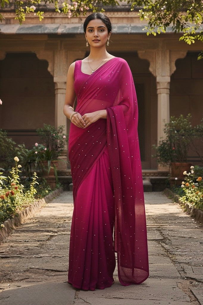 Experience the luxury with our handloomed 100% Pure Mulberry Silk Chiffon Sarees. Hand dyed gradient shades to perfection and crafted with a delicate sequins spread. Offering a soft, luminous fall and a versatile base for your imagination. Perfect Canvas for DIY enthusiasts, you can enhance it with laces, hand embroidery, fabric painting, or other embellishments to create your one-of-a-kind masterpiece—or wear it as-is for timeless elegance and modern sophistication.