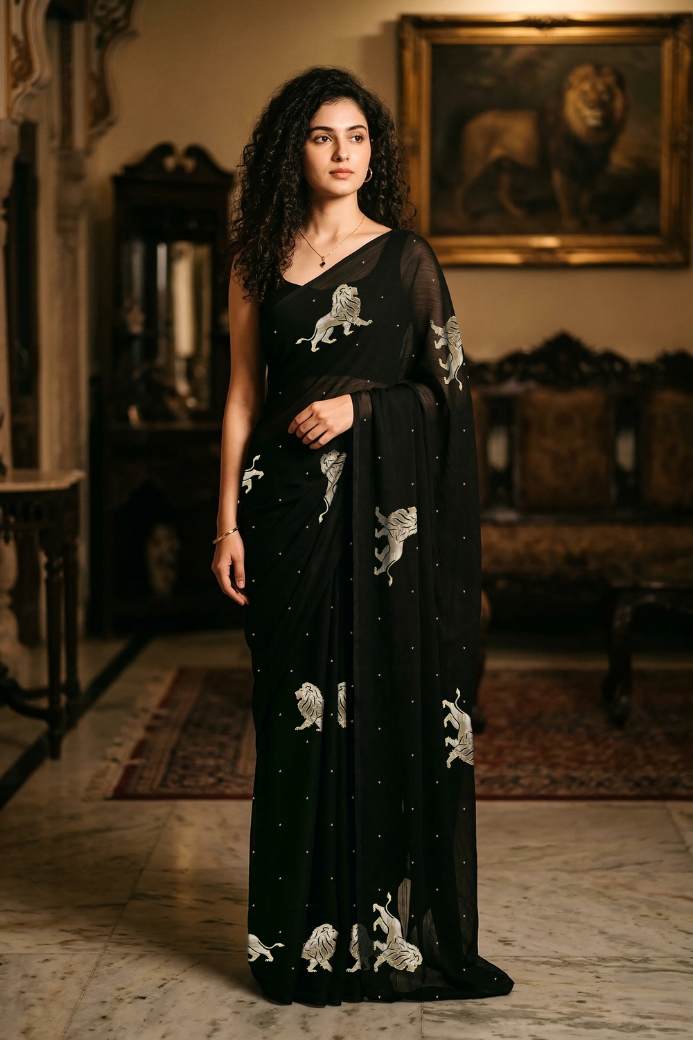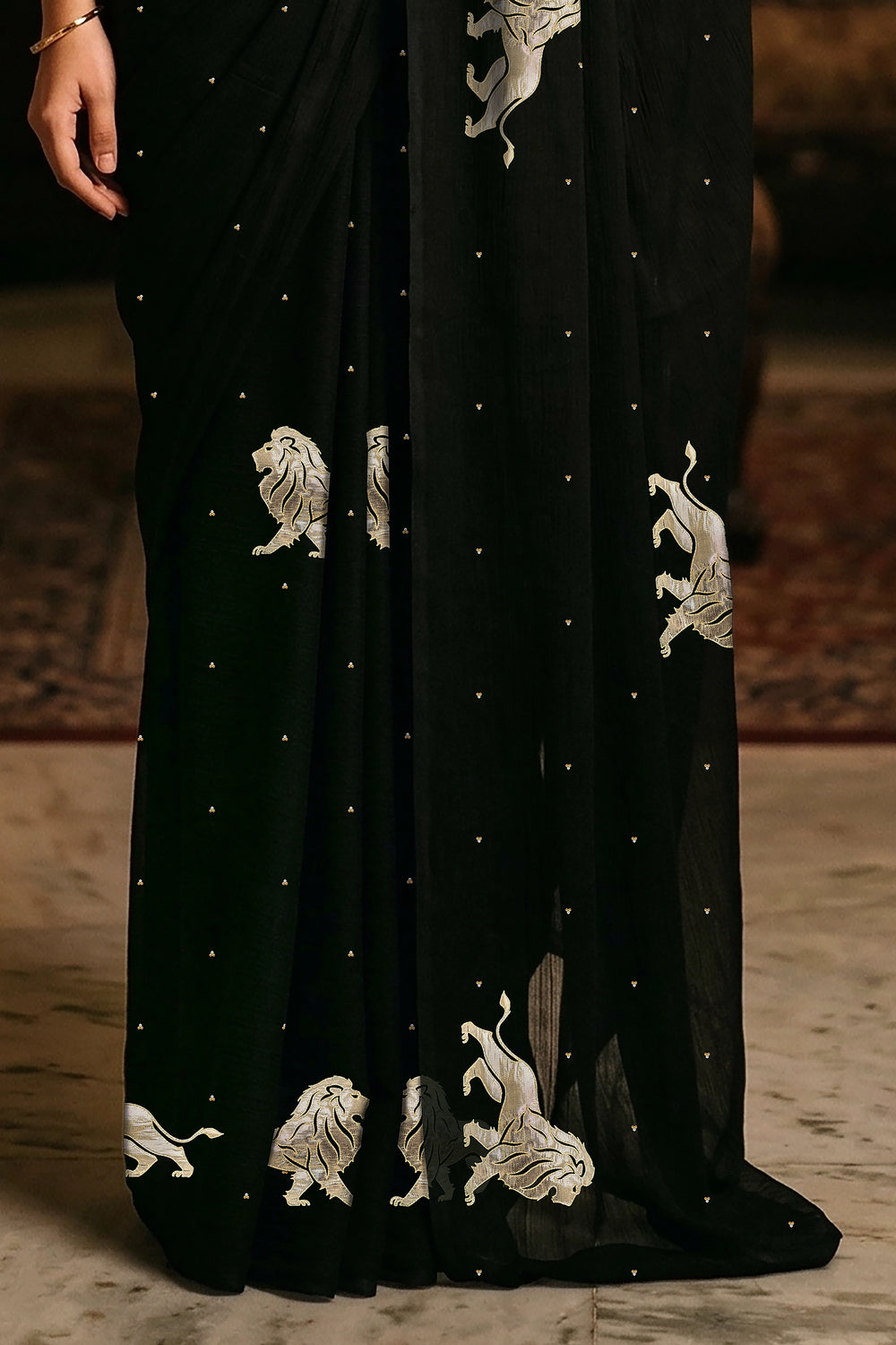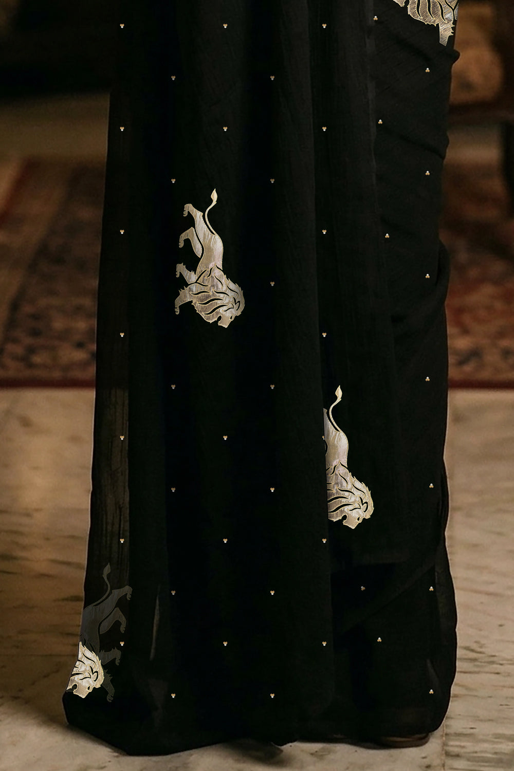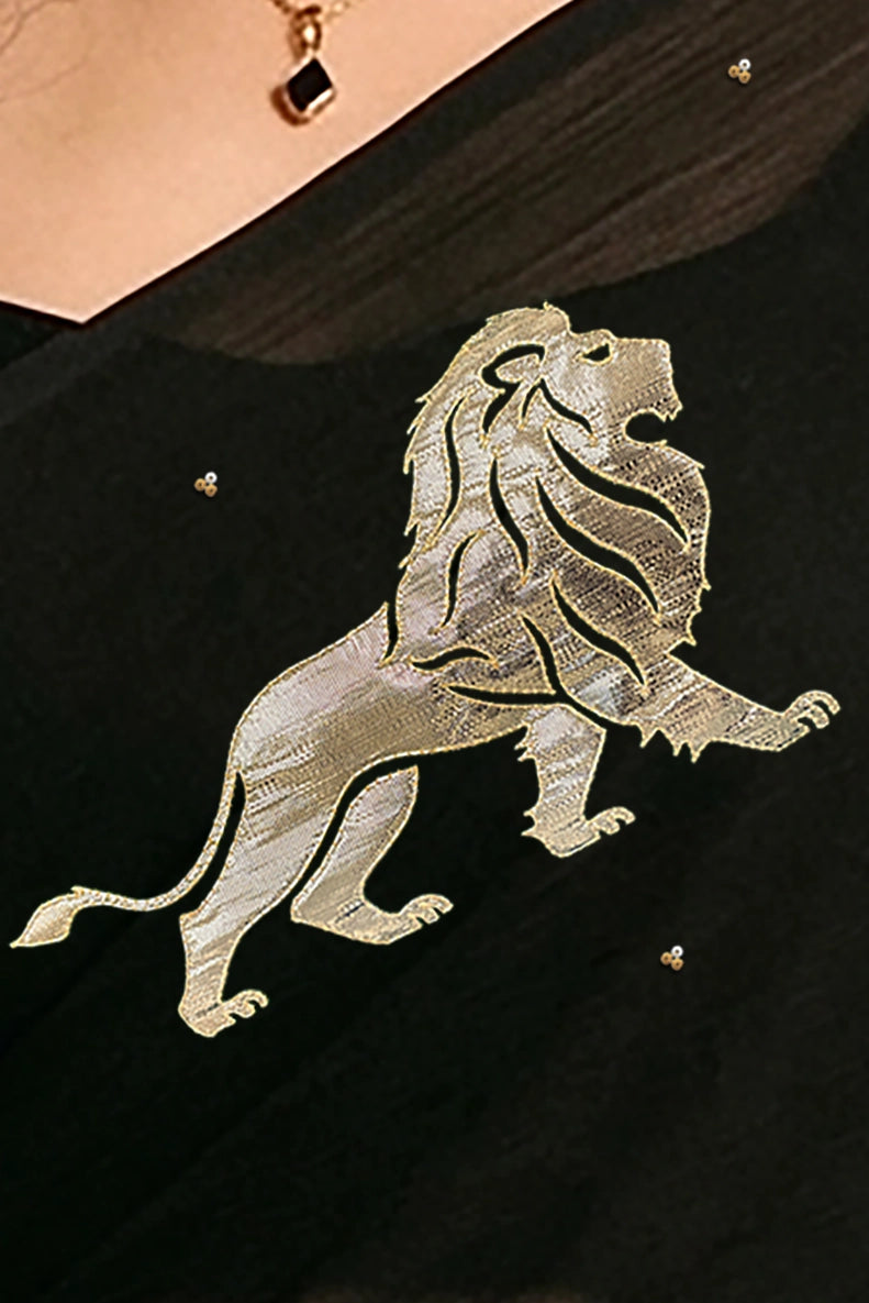 Intricately adorned with hand-embroidered lion motifs, the saree carries a deeper symbolism. The lion represents courage, dignity, and inner power — qualities that resonate with the modern woman who carries tradition with confidence. Each motif is meticulously created using fine Gota-Zardosi craftwork, adding subtle shimmer against the rich black base.
