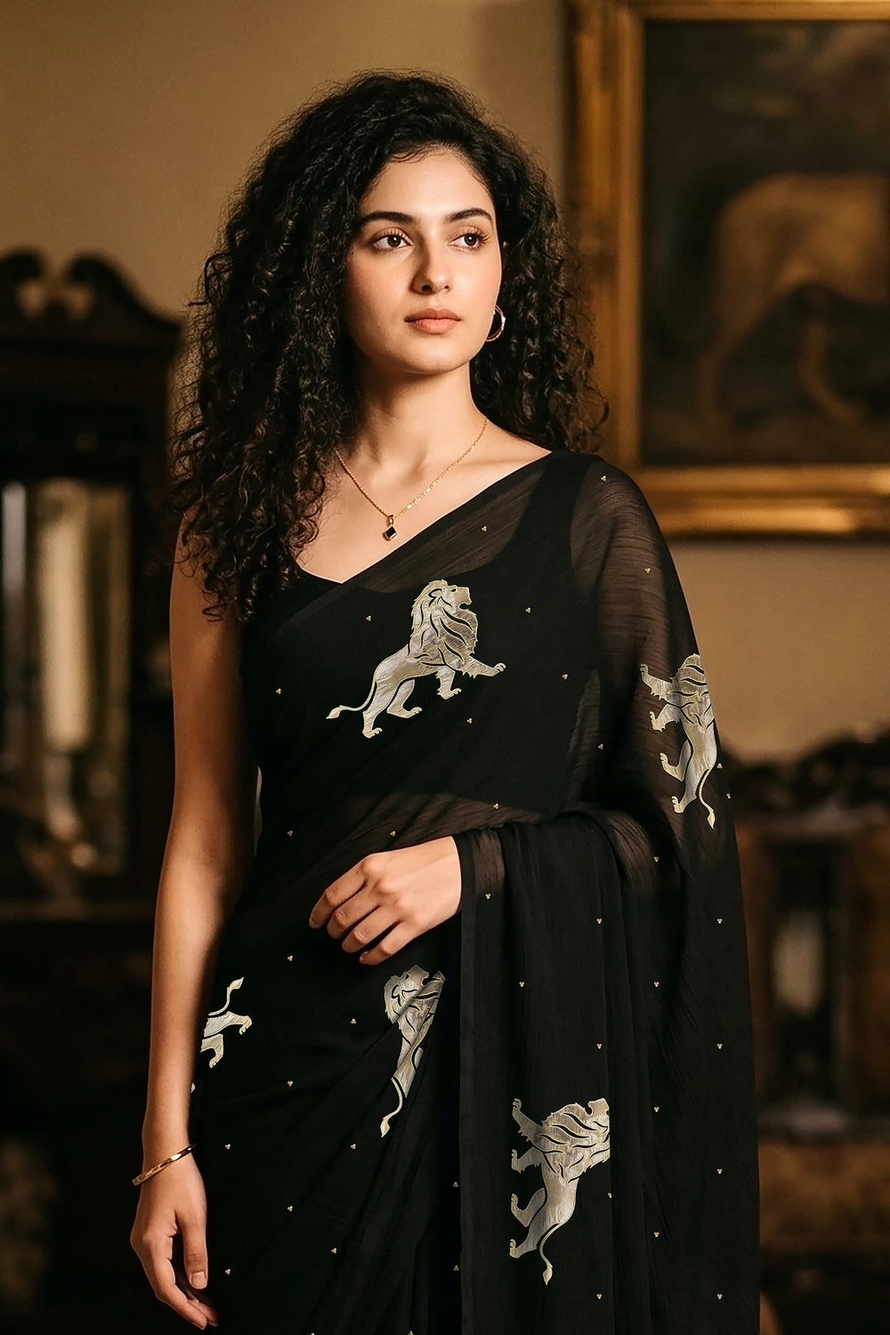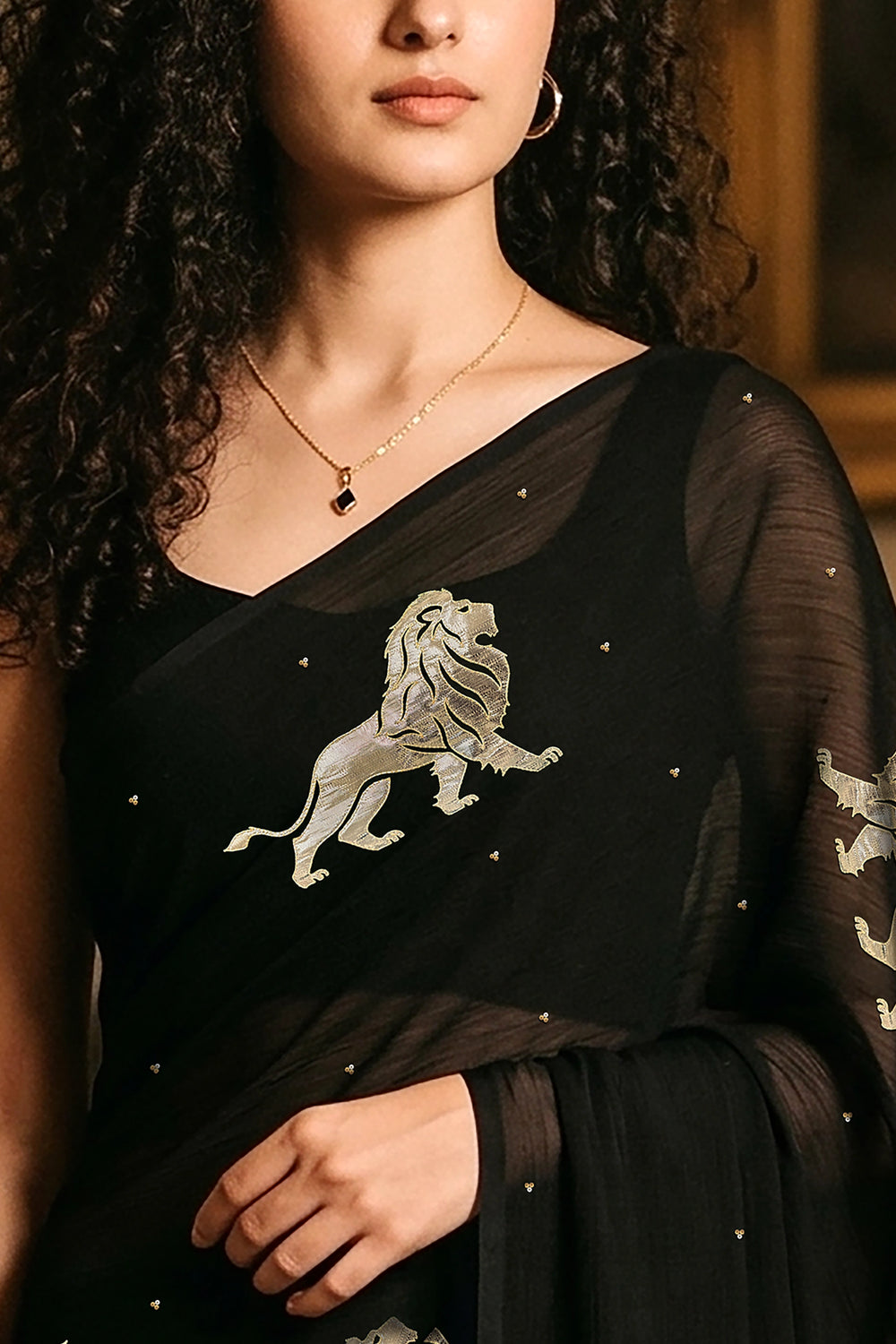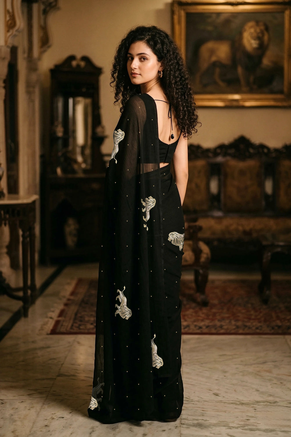 Intricately adorned with hand-embroidered lion motifs, the saree carries a deeper symbolism. The lion represents courage, dignity, and inner power — qualities that resonate with the modern woman who carries tradition with confidence. Each motif is meticulously created using fine Gota-Zardosi craftwork, adding subtle shimmer against the rich black base.
