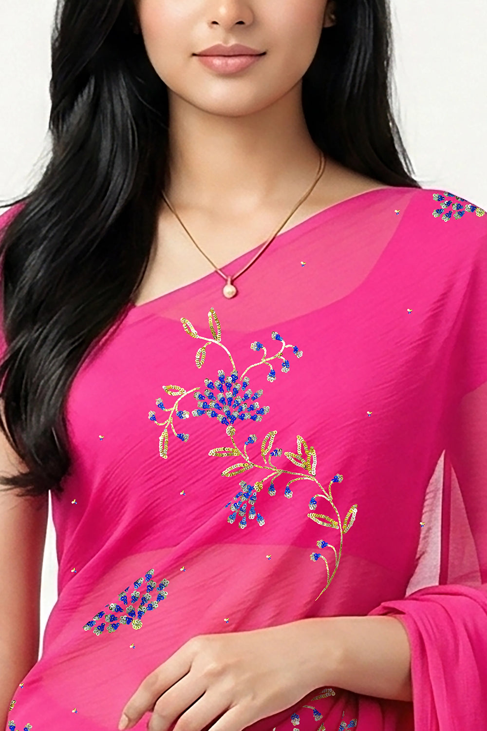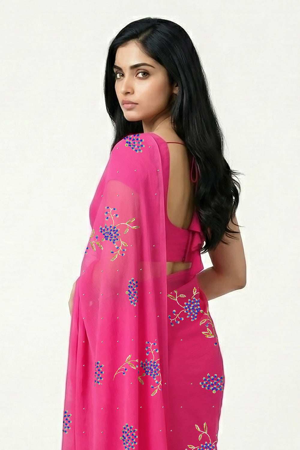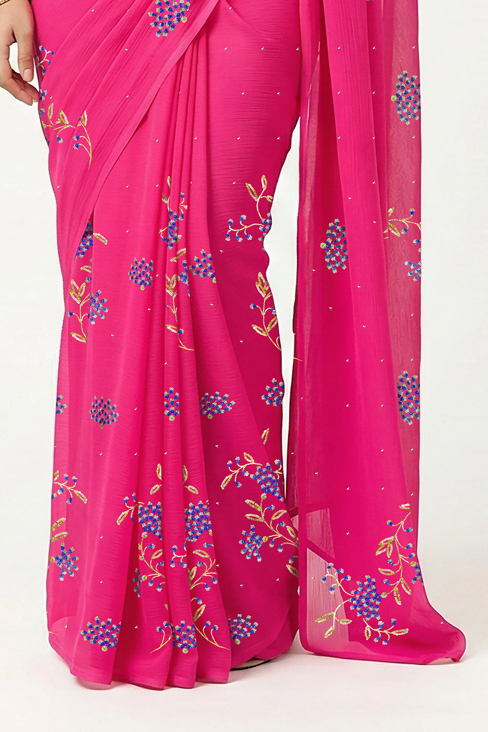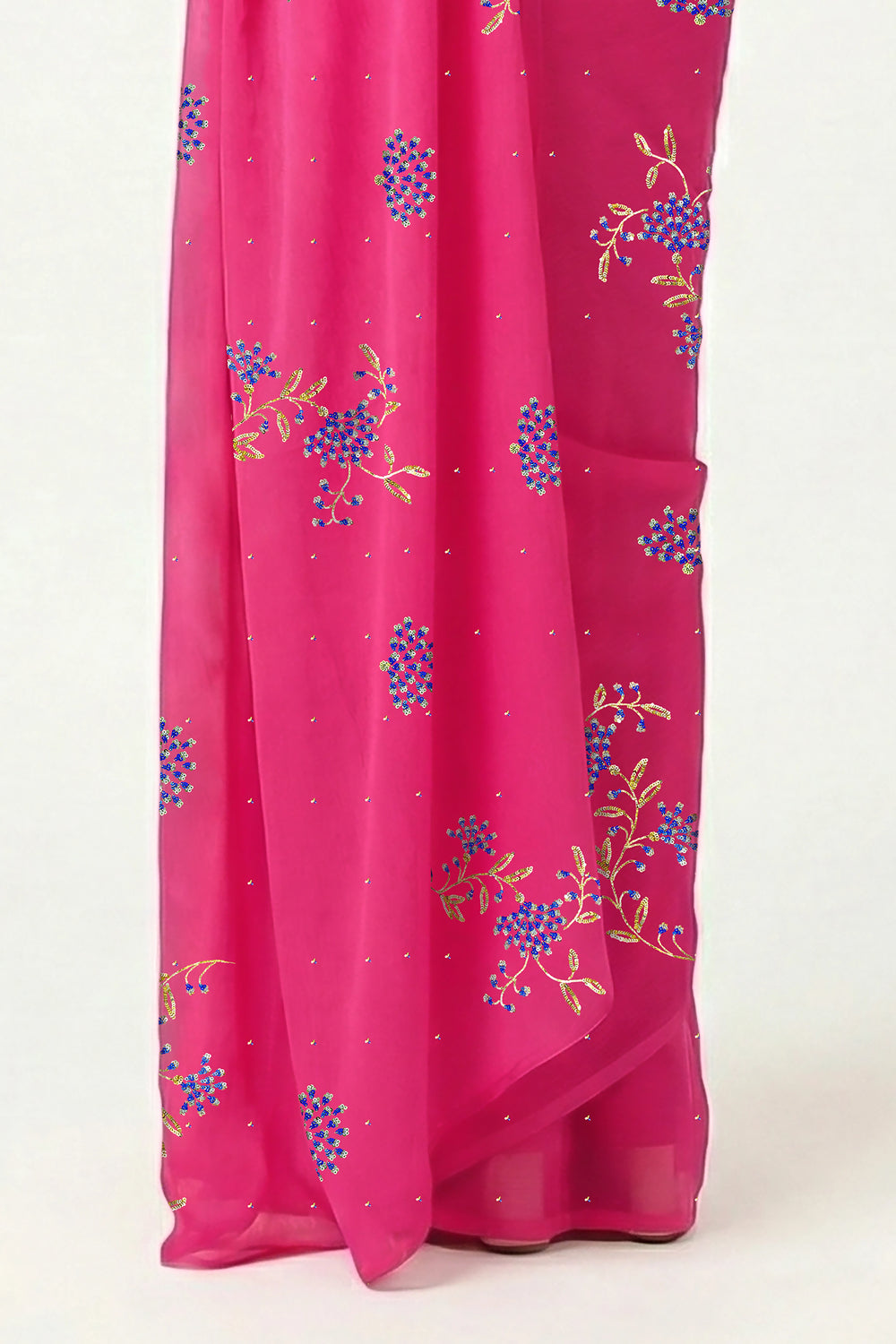 Crafted from the finest Mulberry Silk Chiffon, this ethereal drape radiates in a vivid fuchsia hue, blooming with delicate floral motifs in blue, turquoise, and silver sequins, and kissed with golden sequin twigs and leaves.