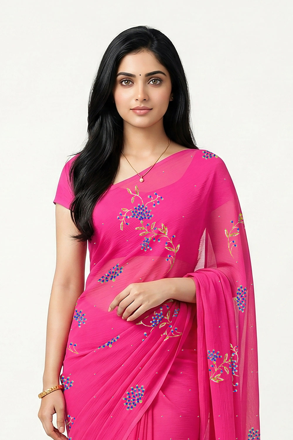 Each intricate detail is brought to life through the time-honored Aari-Taari embroidery, a craft that weaves light, tradition, and luxury into every thread. The fluid fall and soft translucence of the chiffon make it perfect for evening elegance or festive grandeur.