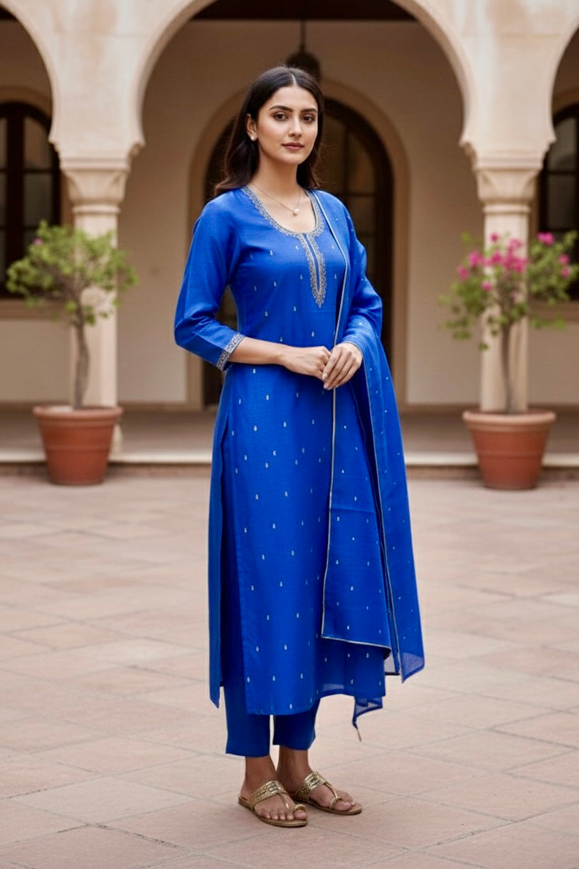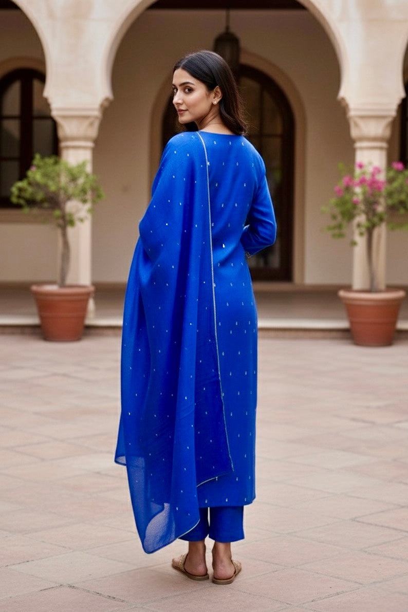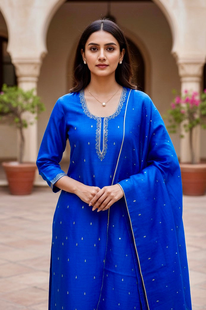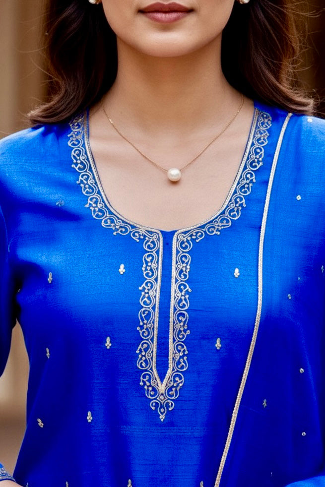 The Neelambri Kurta radiates timeless elegance in a vibrant royal blue hue. Crafted from fine Mulberry Silk Cotton, this unstitched 2.5-meter kurta and bottom set is paired with a soft 2.5 meter Georgette Silk dupatta. Adorned with handcrafted sequins and zari neckline, it captures the essence of traditional artistry with a contemporary charm—perfect for festive and elegant occasions.