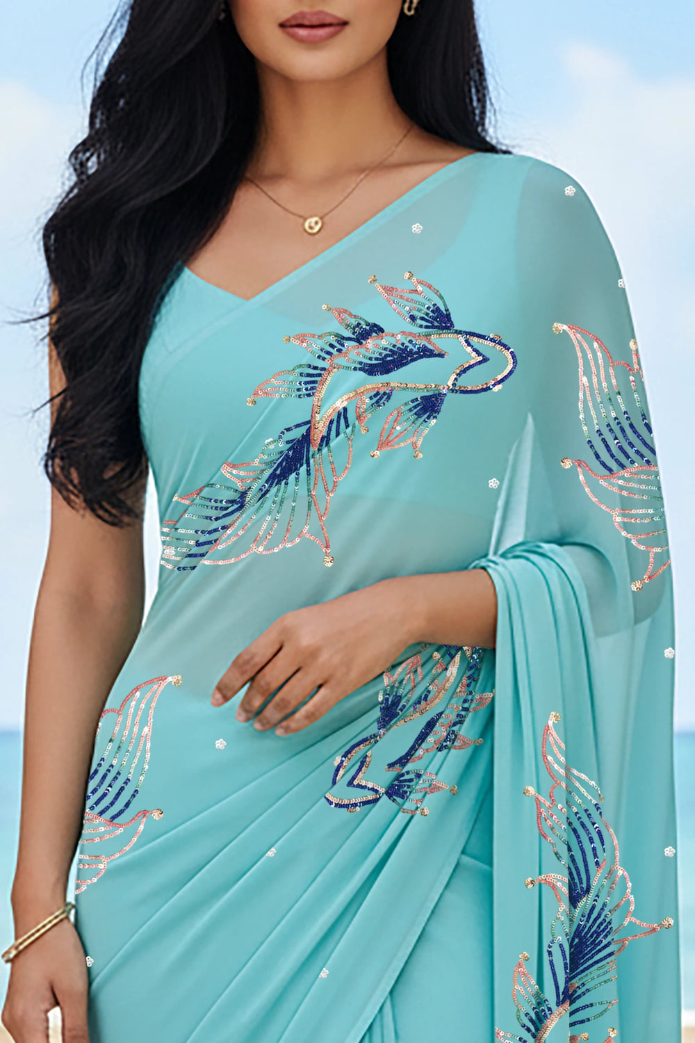 Flow like the waves in Samudrika — where ocean blue melts into sea green on the softest Mulberry Silk Platinum Chiffon. The koi fish, hand-embroidered in sparkling blue, sea green, and silver sequins, shimmer as they swim across the drape. Breezy, fluid, and full of charm, this saree is your ocean escape wrapped in silk.