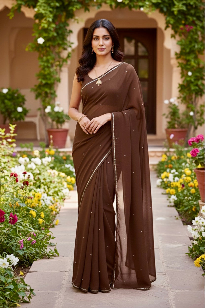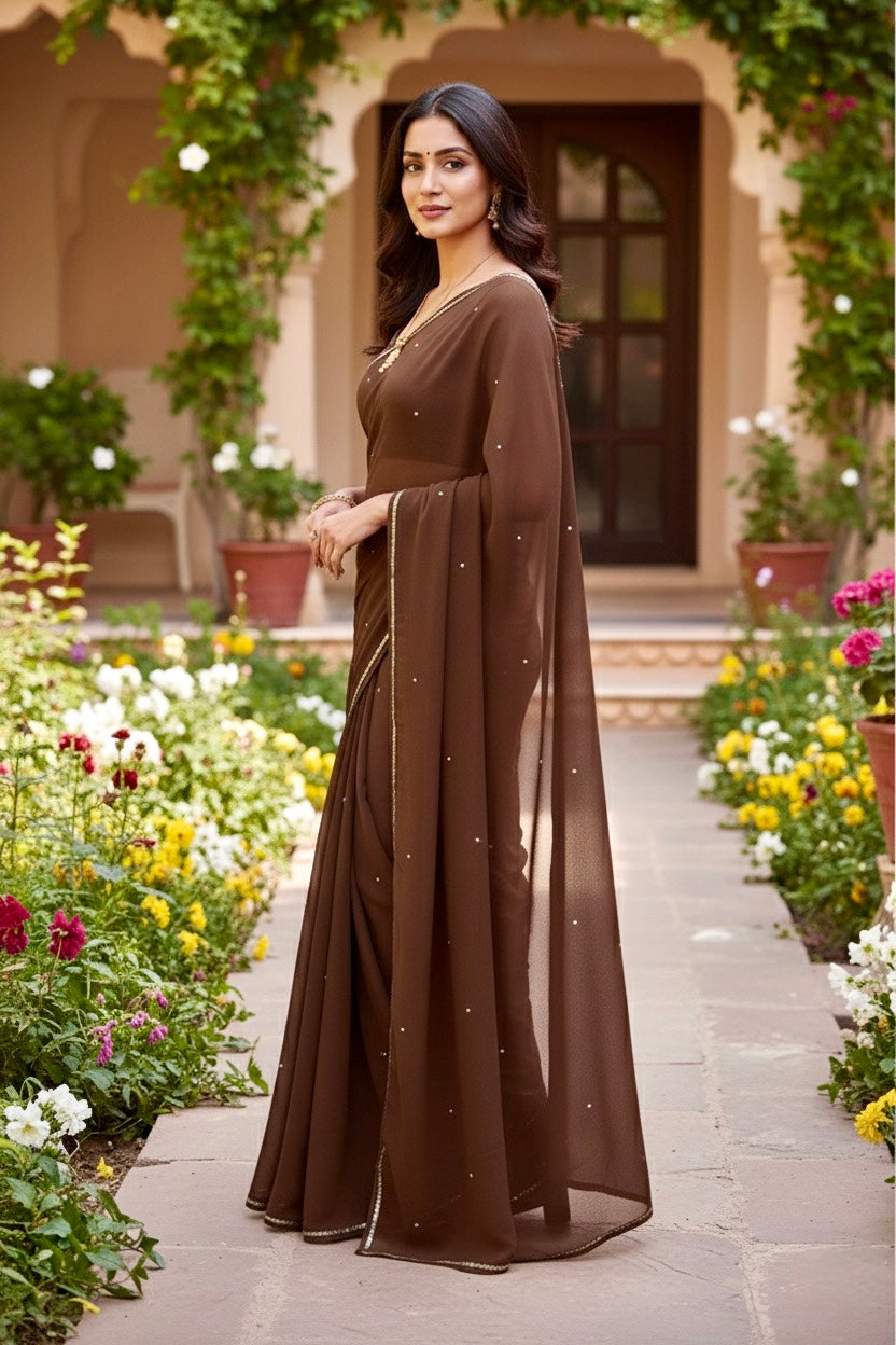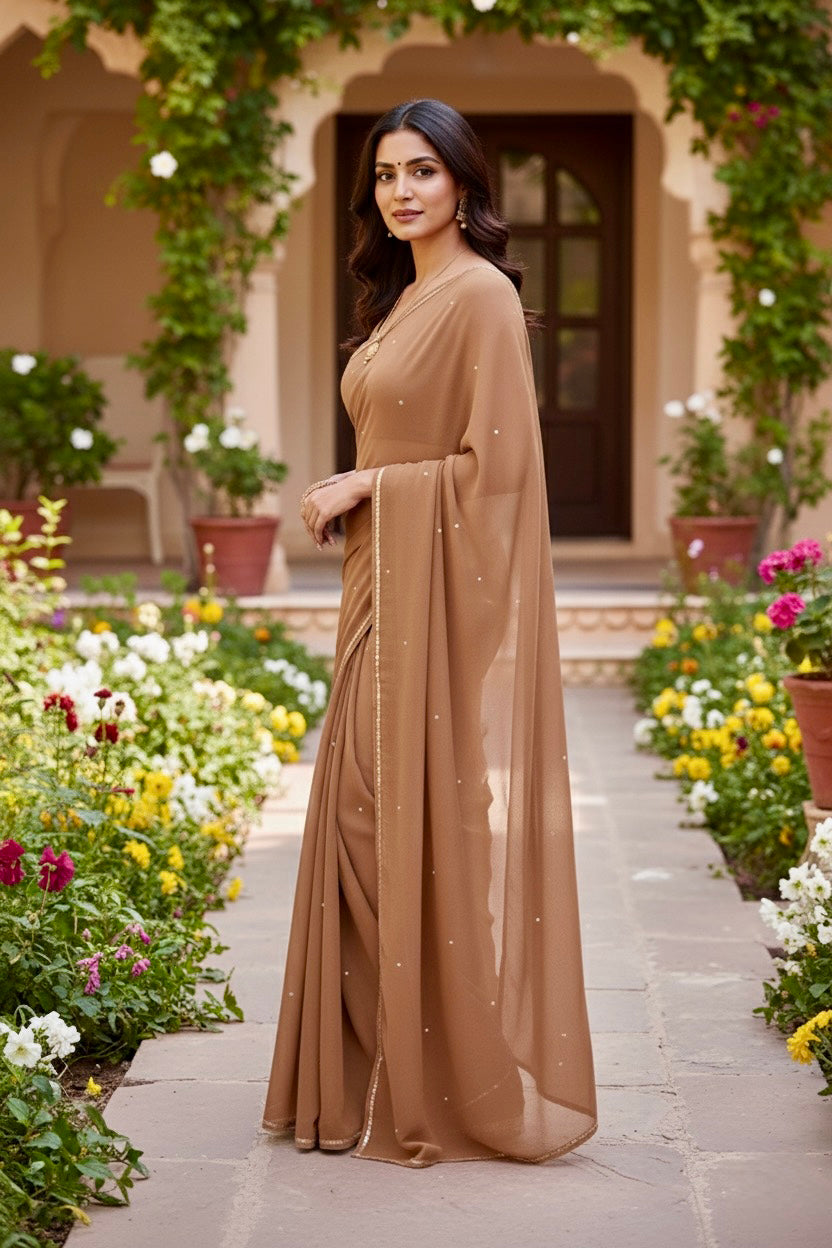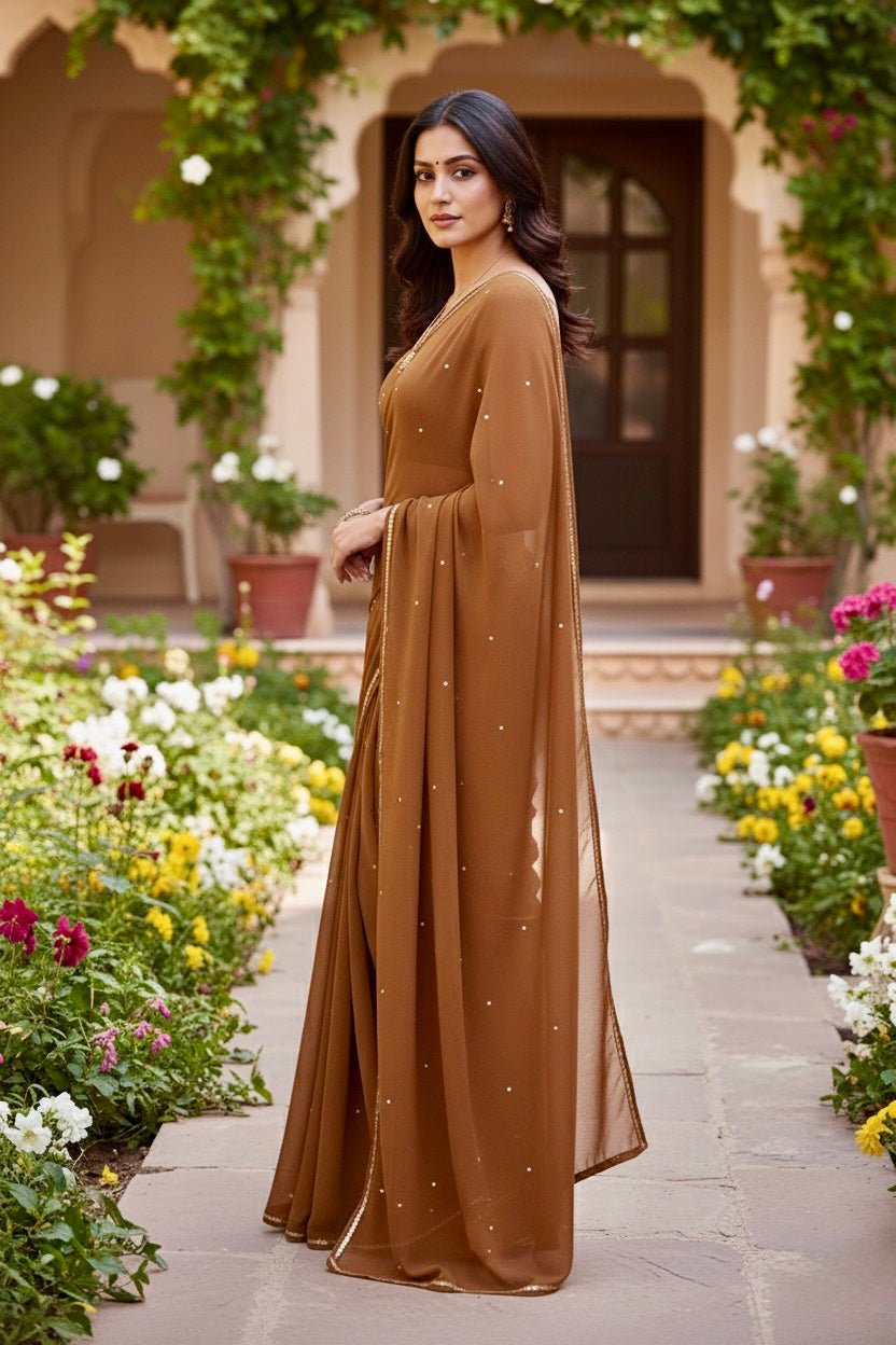 Celebrate the Indian craftsmanship with our 100% Pure Mulberry Silk Chiffon Saree. Handloomed and hand-dyed shades of Brown to perfection, it features a soft, fluid drape with a subtle sequins spread and an elegant border.  Perfect for DIY enthusiasts and designers, this timeless saree invites creative customization—add laces, gota, or hand embroidery for a personalized touch, or wear it as-is for effortless sophistication.