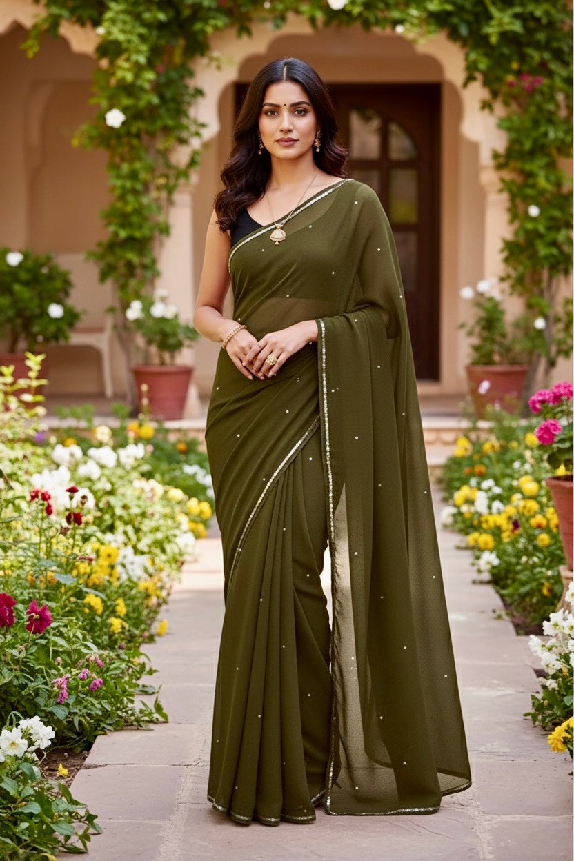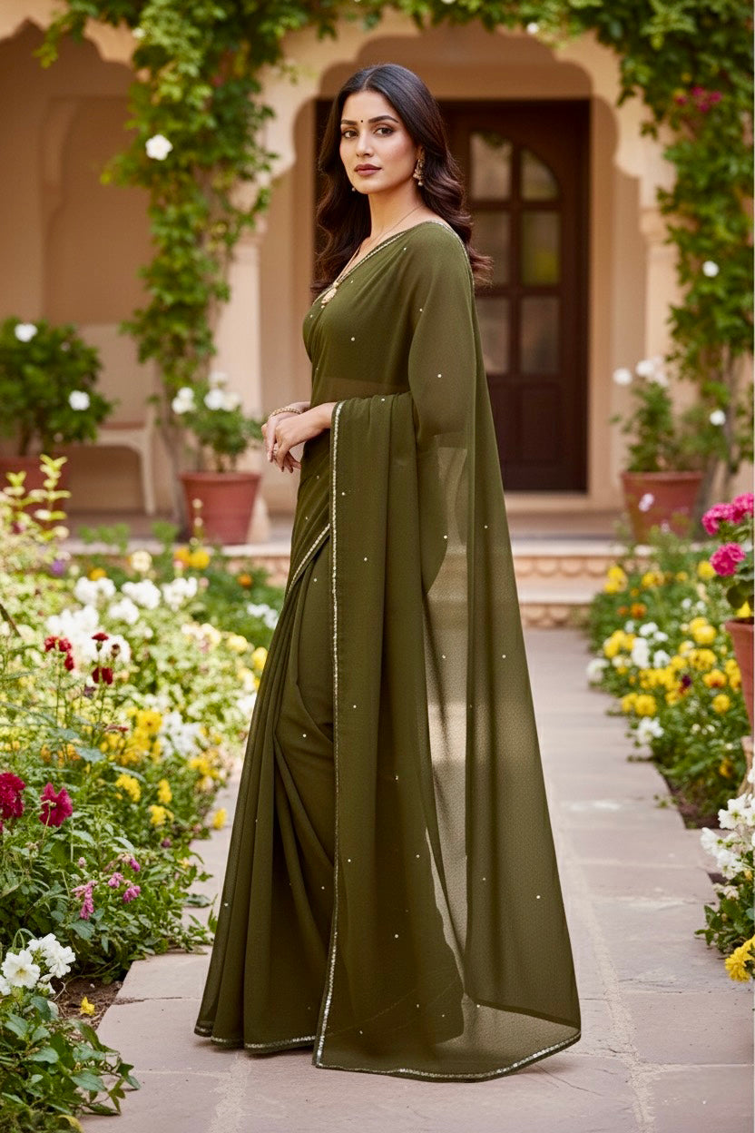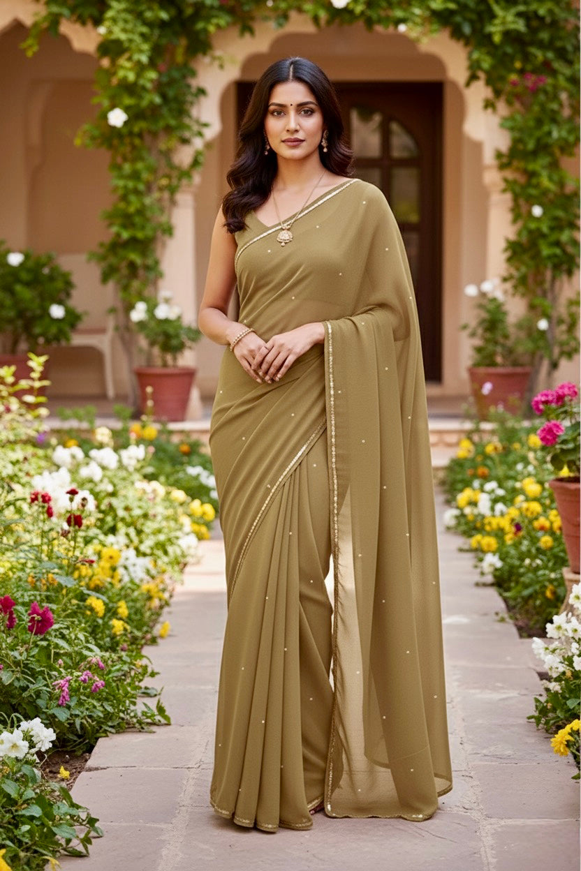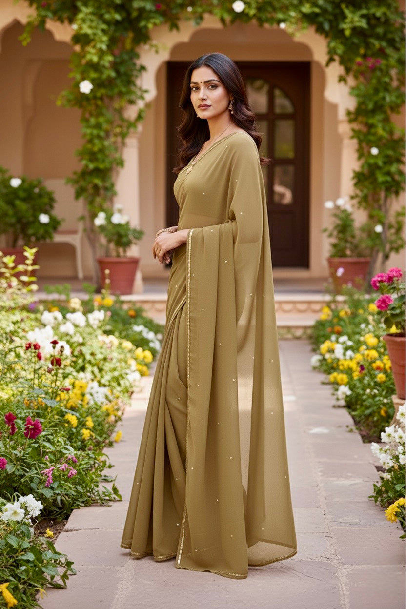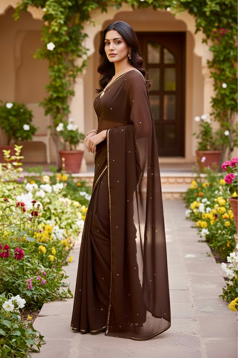 Celebrate the Indian craftsmanship with our 100% Pure Mulberry Silk Chiffon Saree. Handloomed and hand-dyed shades of Brown to perfection, it features a soft, fluid drape with a subtle sequins spread and an elegant border.  Perfect for DIY enthusiasts and designers, this timeless saree invites creative customization—add laces, gota, or hand embroidery for a personalized touch, or wear it as-is for effortless sophistication.
