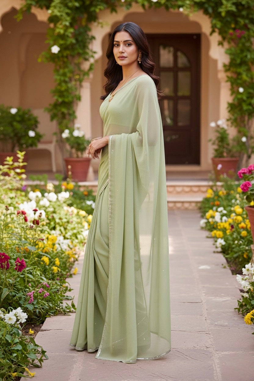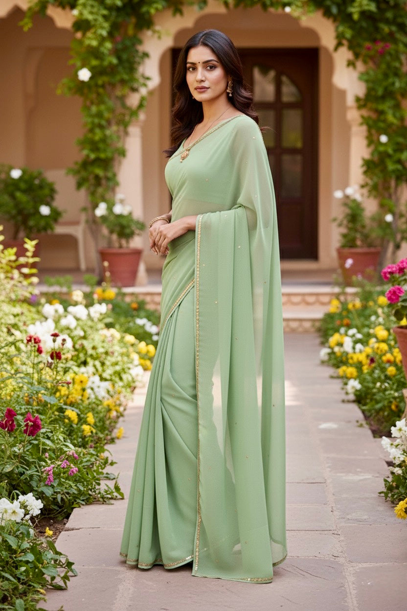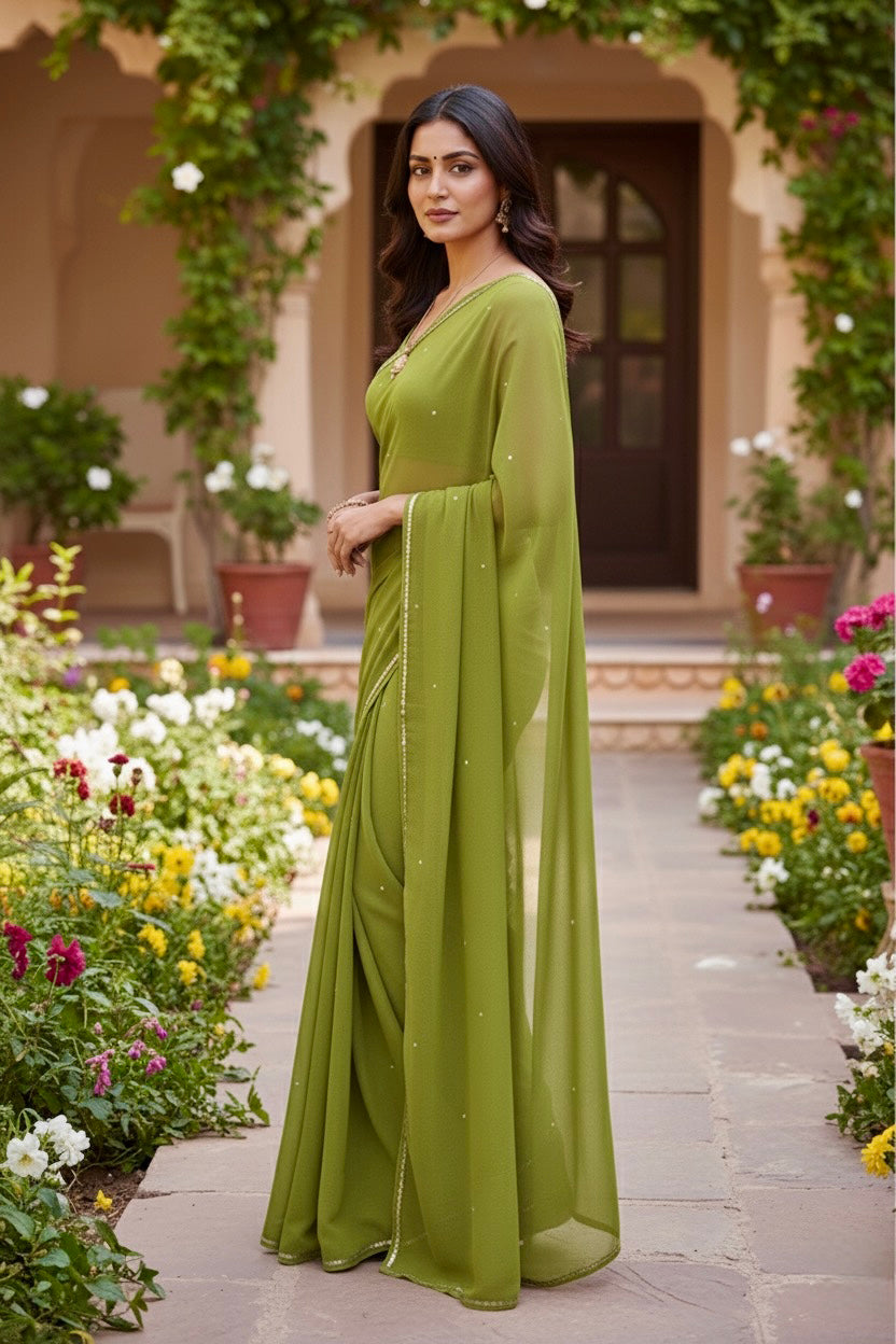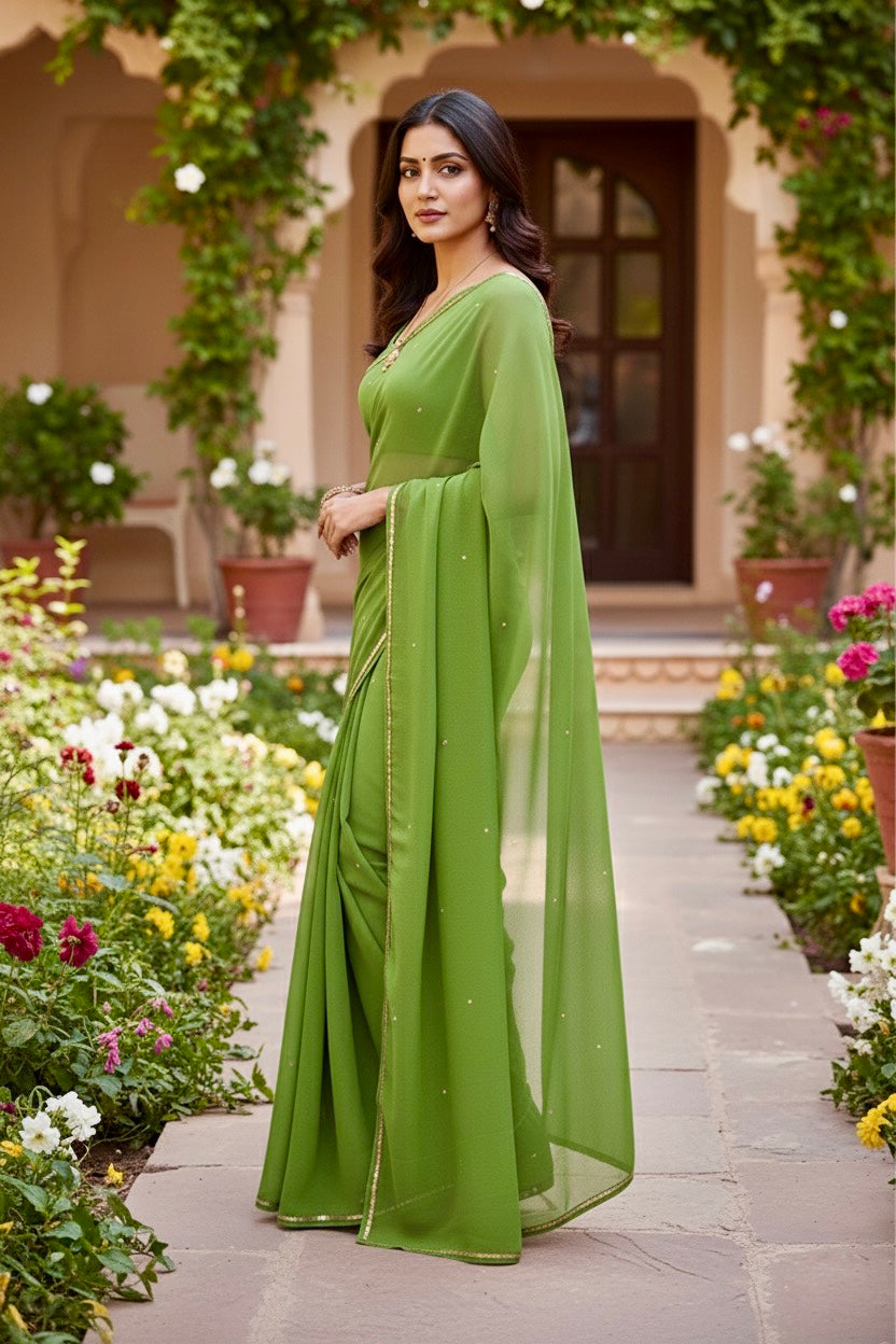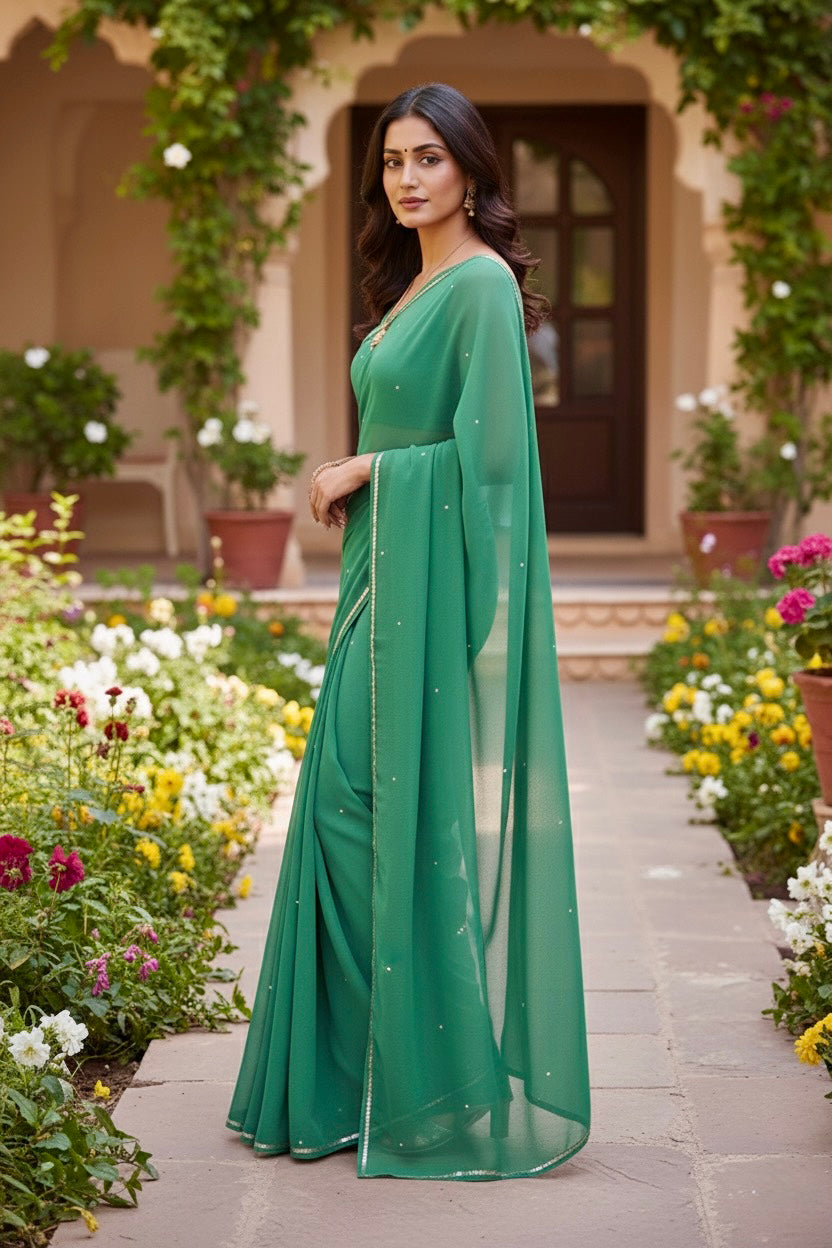 Celebrate the Indian craftsmanship with our 100% Pure Mulberry Silk Chiffon Saree. Handloomed and hand-dyed shades of Green to perfection, it features a soft, fluid drape with a subtle sequins spread and an elegant border.  Perfect for DIY enthusiasts and designers, this timeless saree invites creative customization—add laces, gota, or hand embroidery for a personalized touch, or wear it as-is for effortless sophistication.