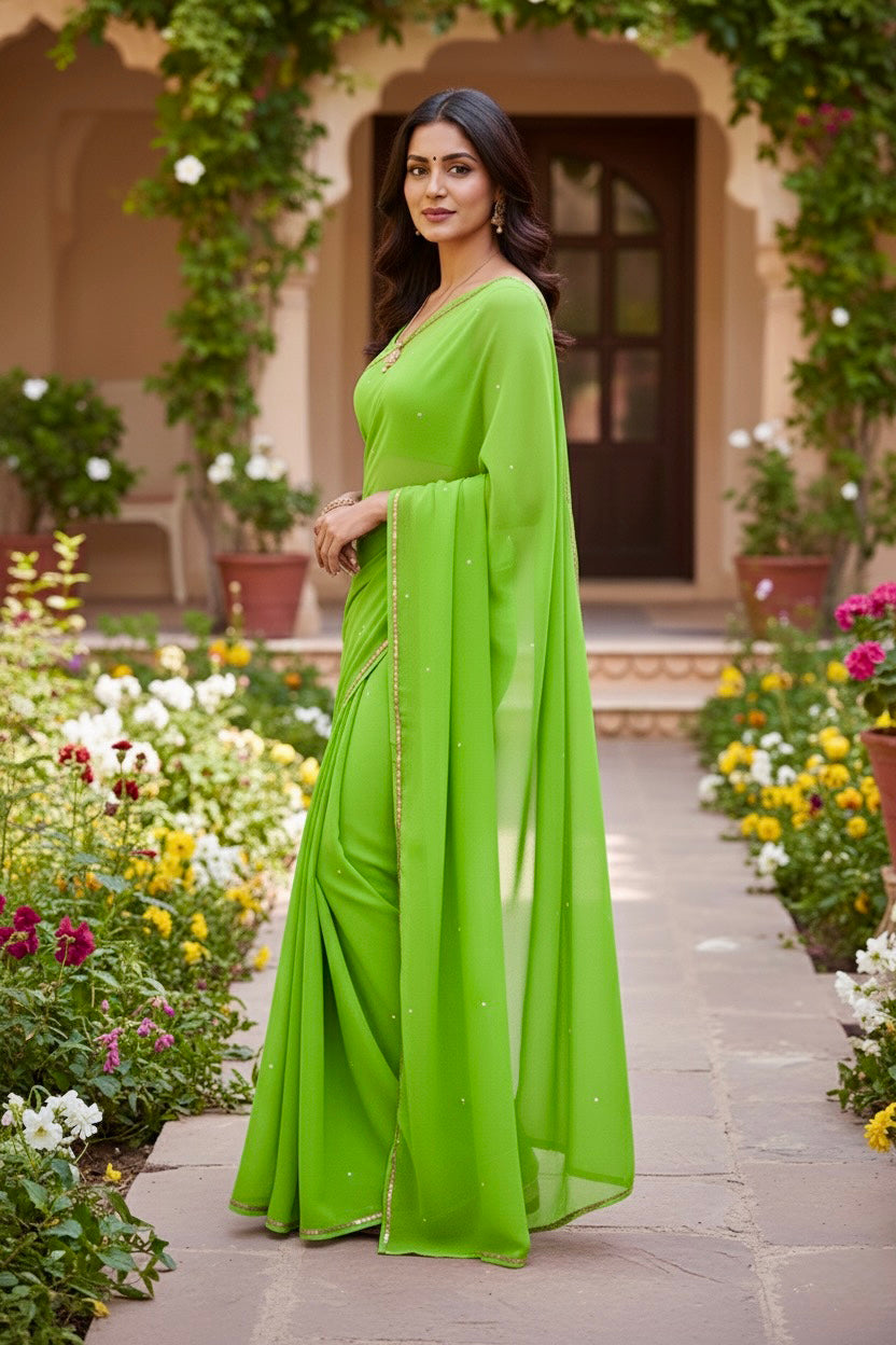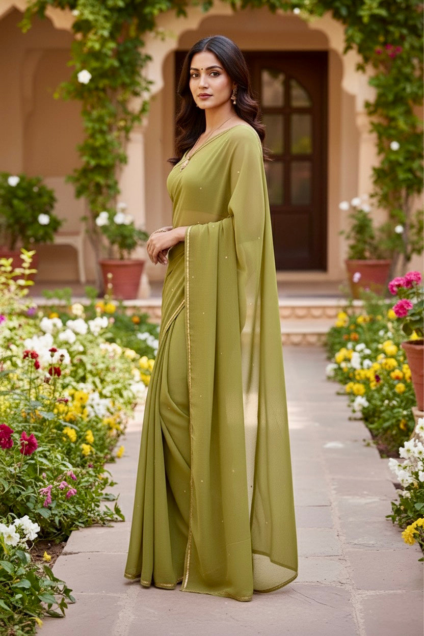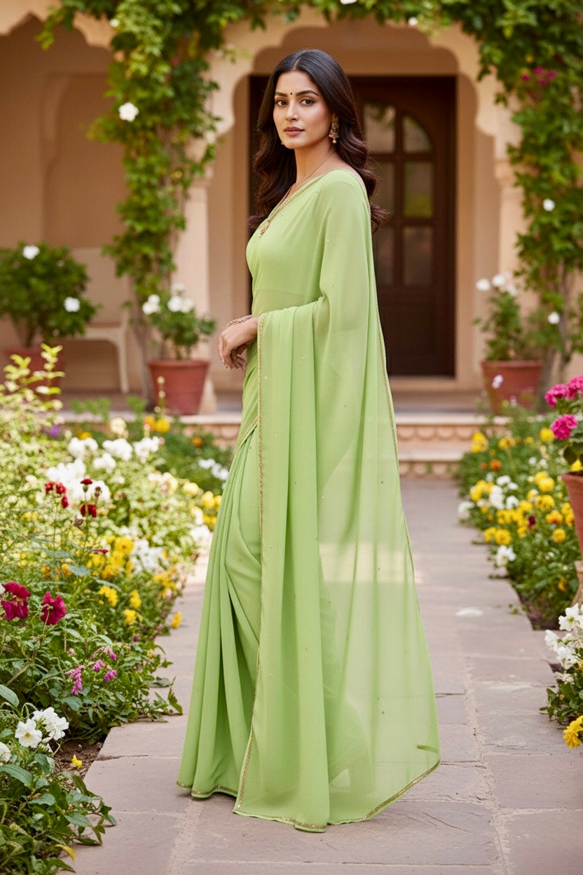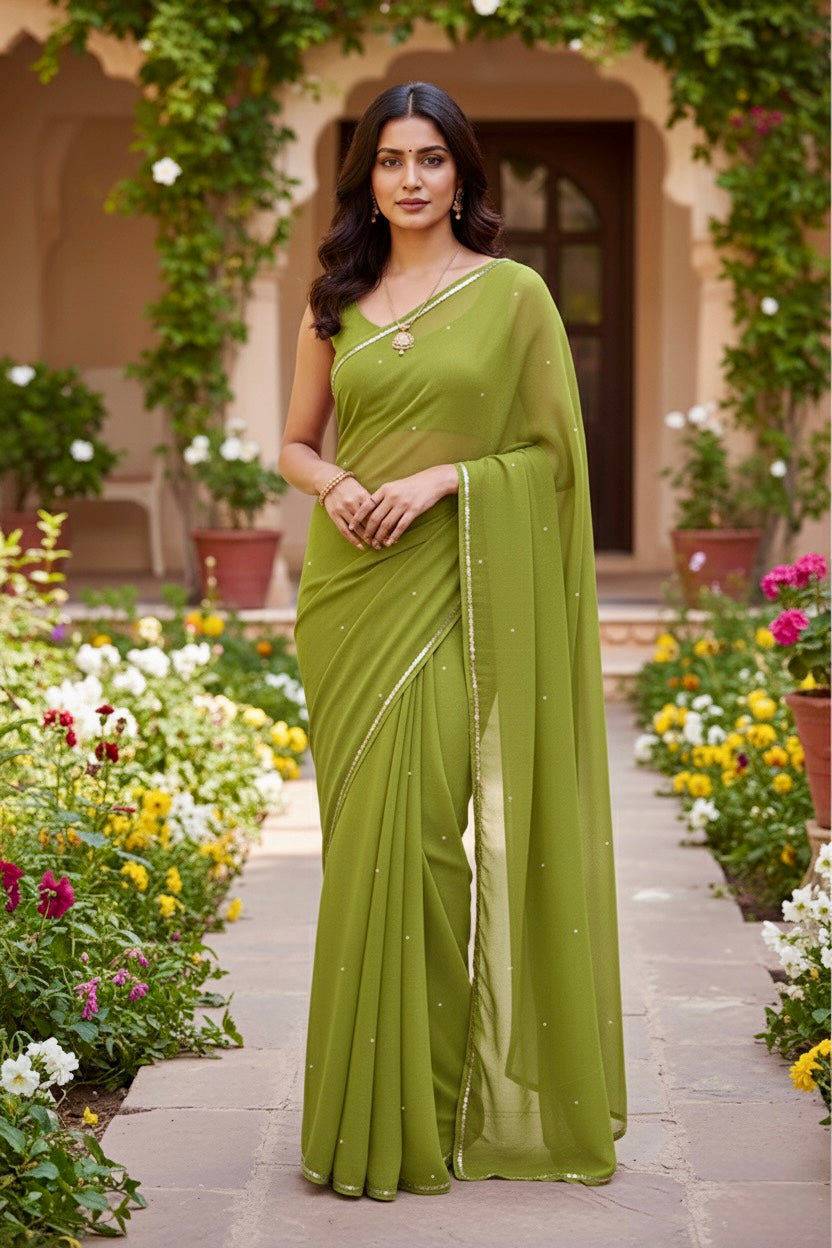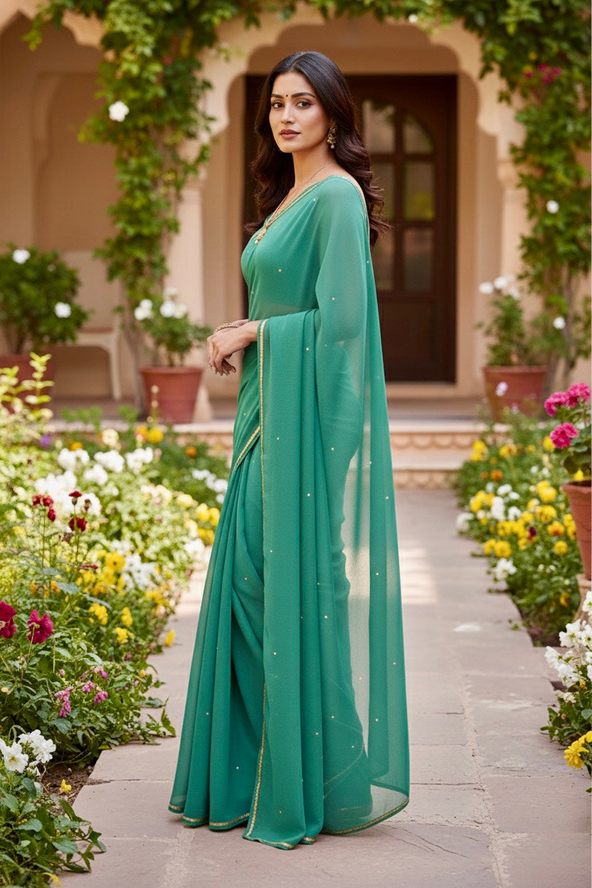 Celebrate the Indian craftsmanship with our 100% Pure Mulberry Silk Chiffon Saree. Handloomed and hand-dyed shades of Green to perfection, it features a soft, fluid drape with a subtle sequins spread and an elegant border.  Perfect for DIY enthusiasts and designers, this timeless saree invites creative customization—add laces, gota, or hand embroidery for a personalized touch, or wear it as-is for effortless sophistication.