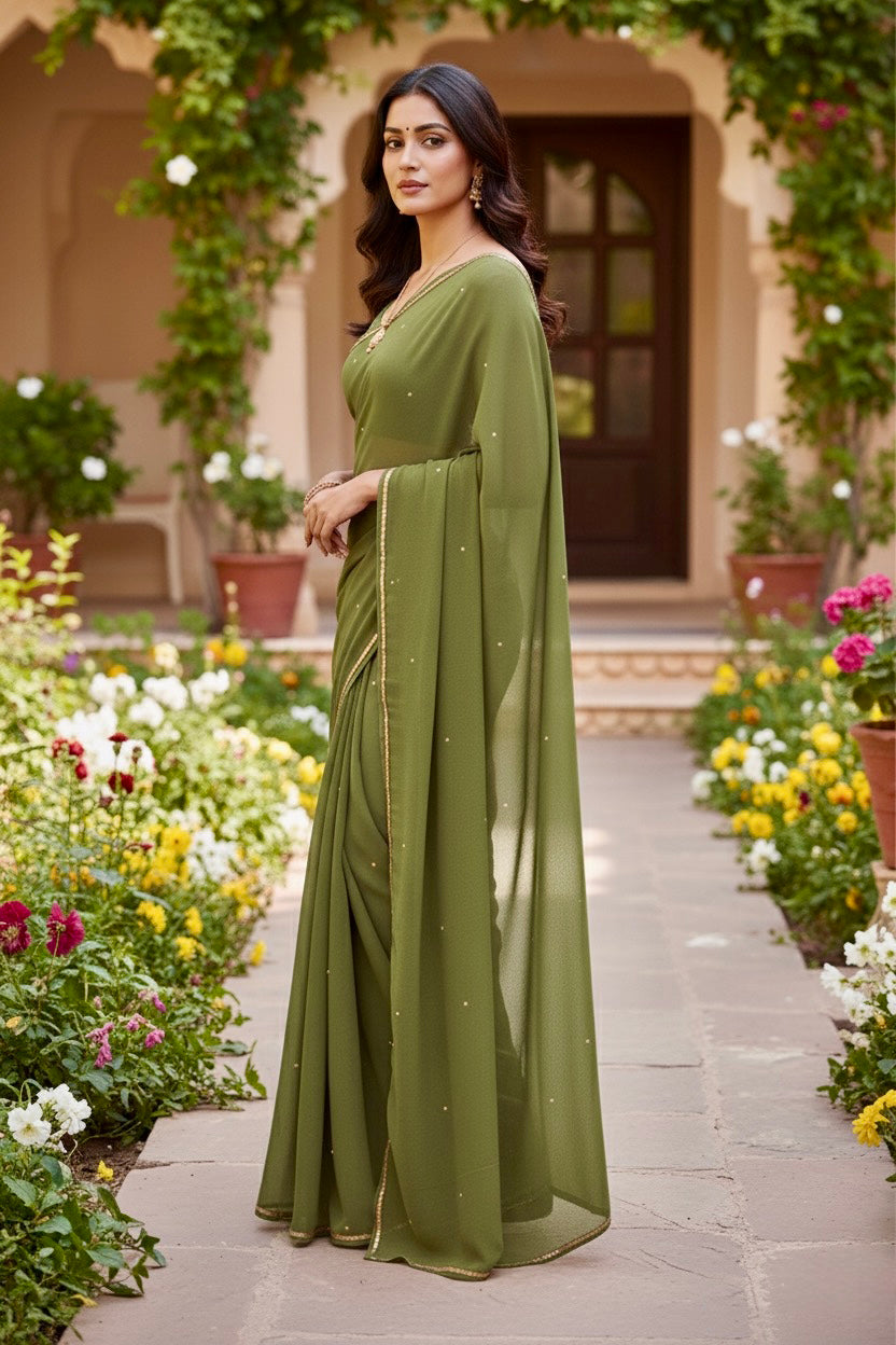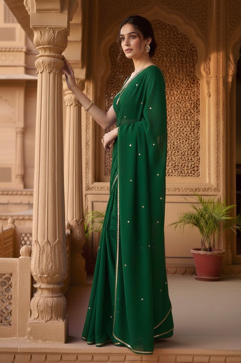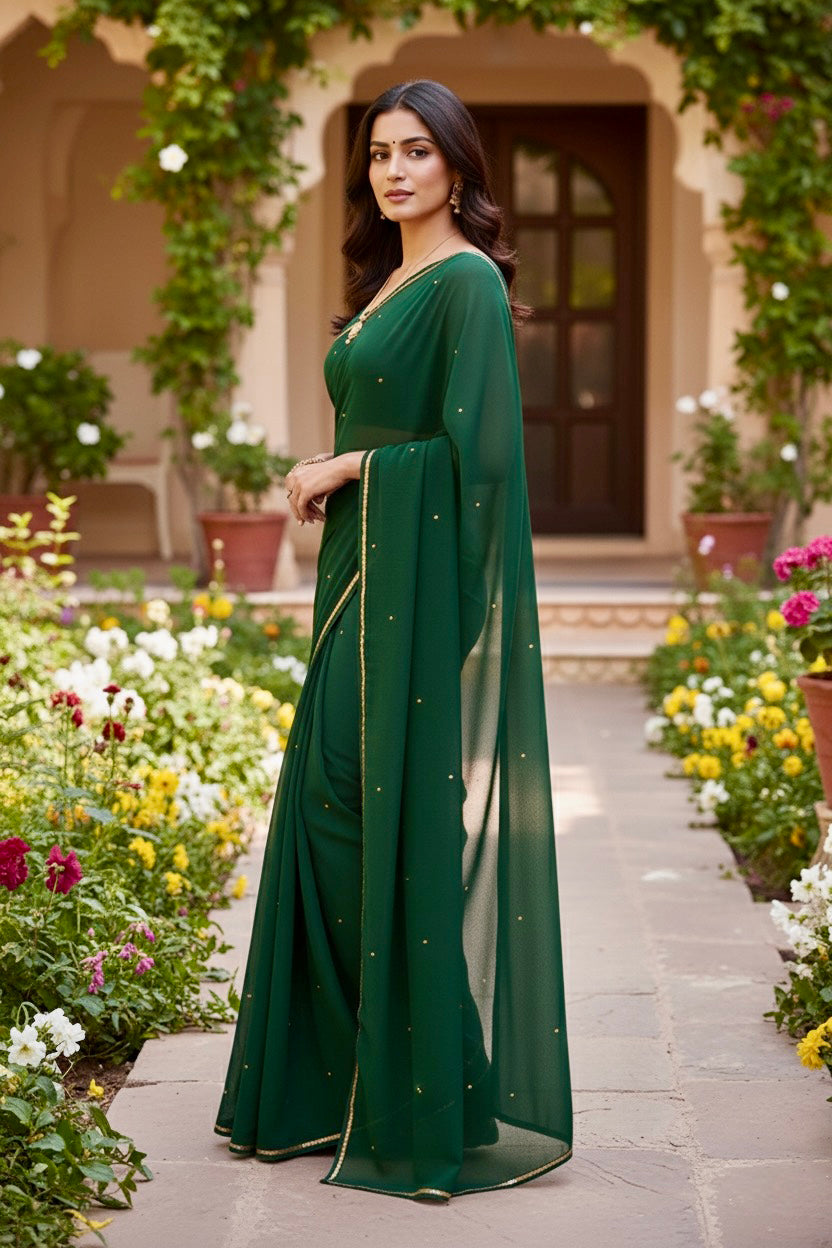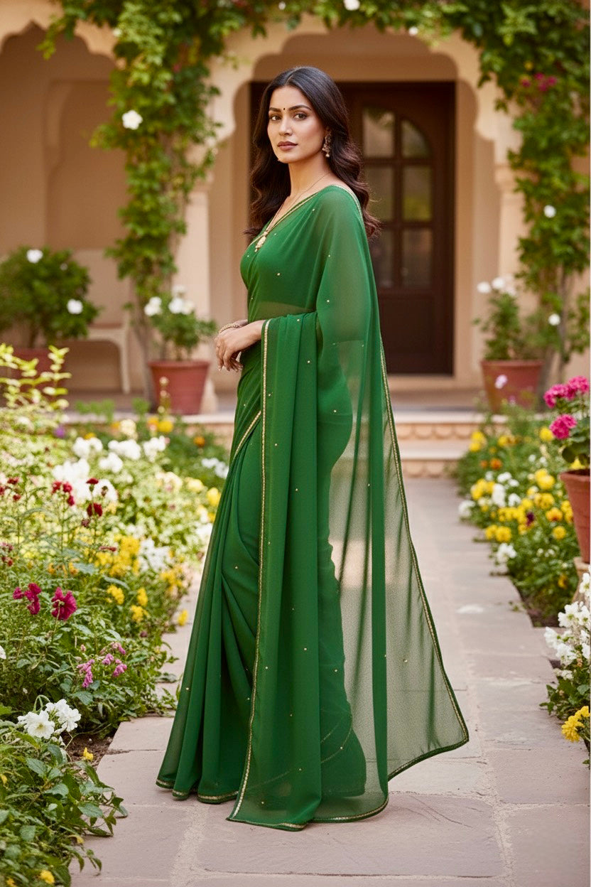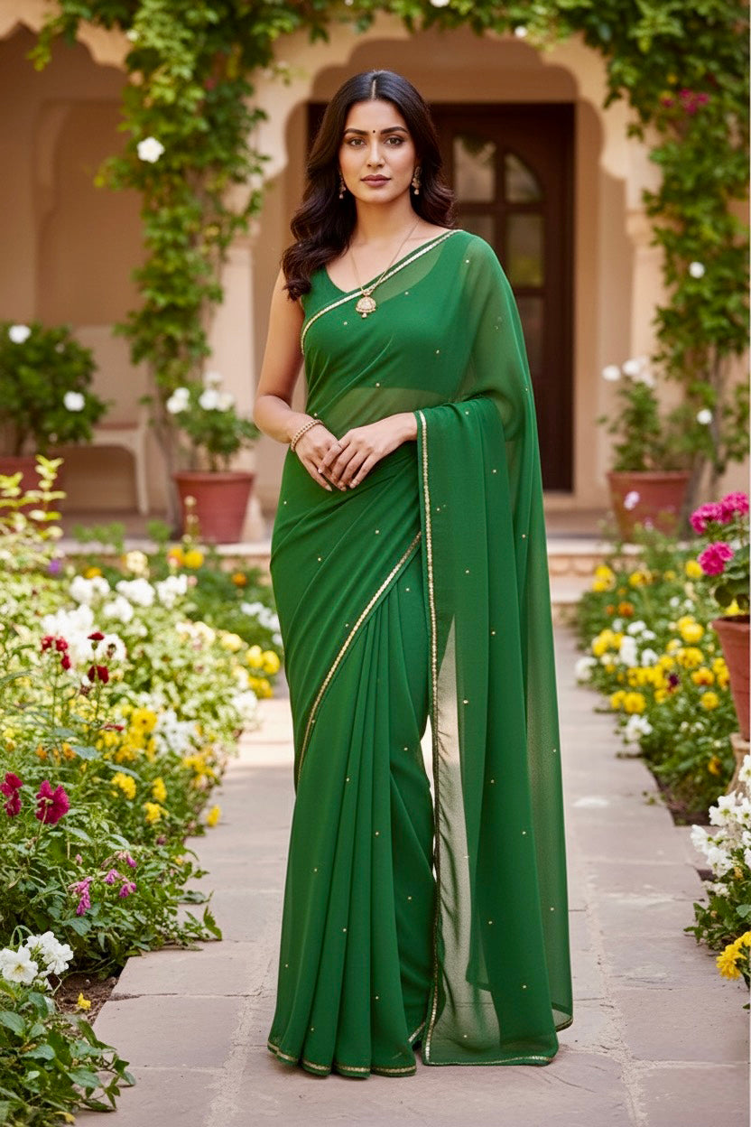 Celebrate the Indian craftsmanship with our 100% Pure Mulberry Silk Chiffon Saree. Handloomed and hand-dyed shades of Green to perfection, it features a soft, fluid drape with a subtle sequins spread and an elegant border.  Perfect for DIY enthusiasts and designers, this timeless saree invites creative customization—add laces, gota, or hand embroidery for a personalized touch, or wear it as-is for effortless sophistication.