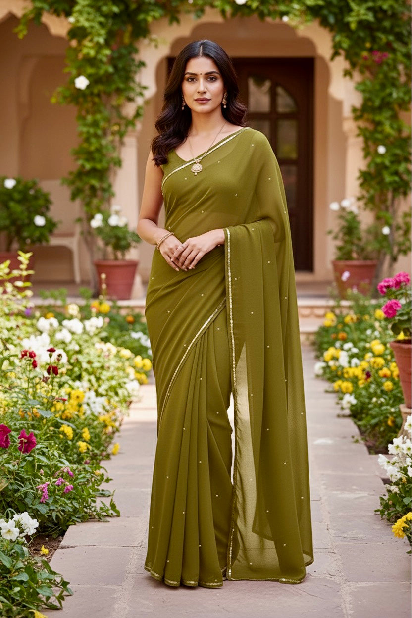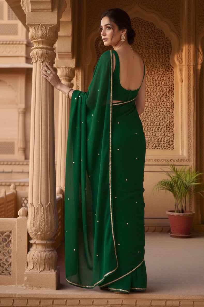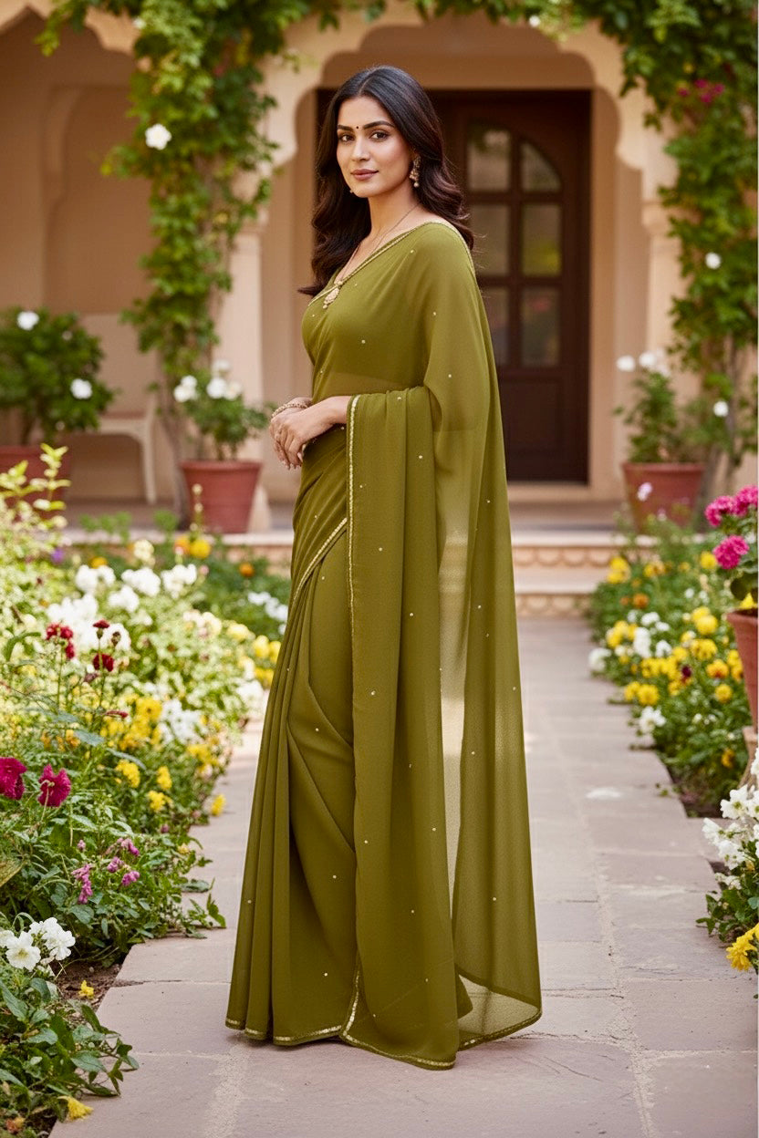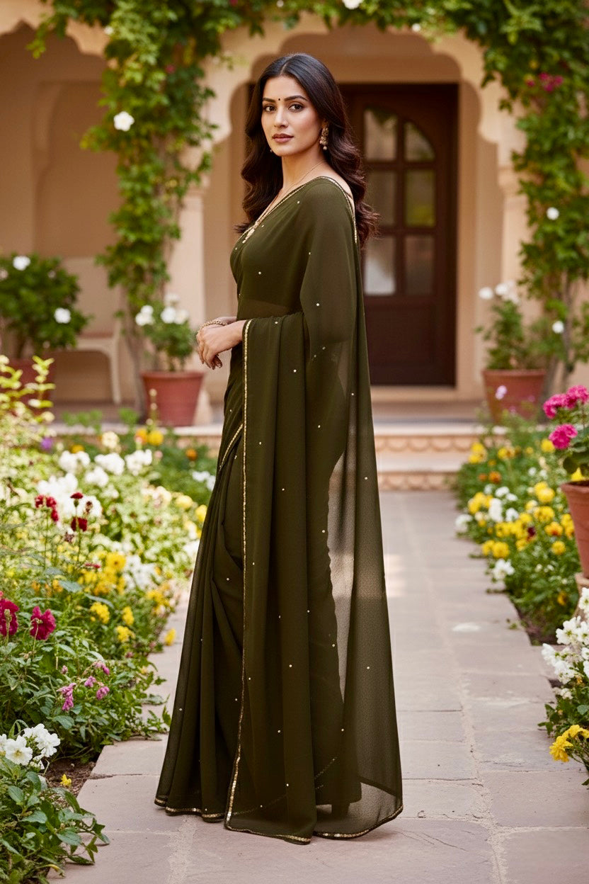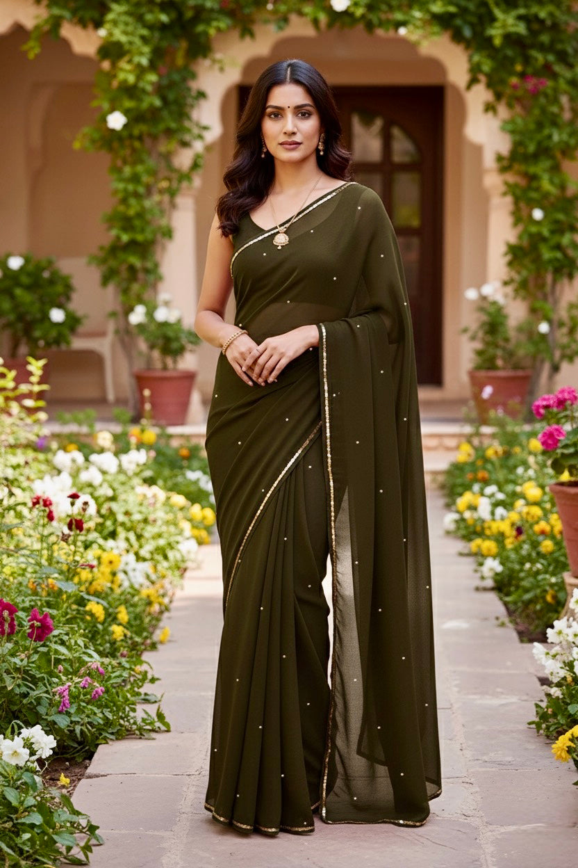 Celebrate the Indian craftsmanship with our 100% Pure Mulberry Silk Chiffon Saree. Handloomed and hand-dyed shades of Green to perfection, it features a soft, fluid drape with a subtle sequins spread and an elegant border.  Perfect for DIY enthusiasts and designers, this timeless saree invites creative customization—add laces, gota, or hand embroidery for a personalized touch, or wear it as-is for effortless sophistication.