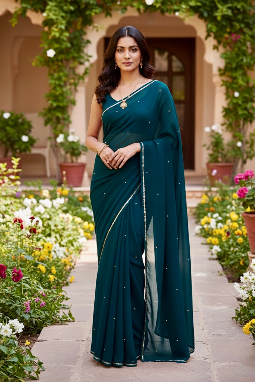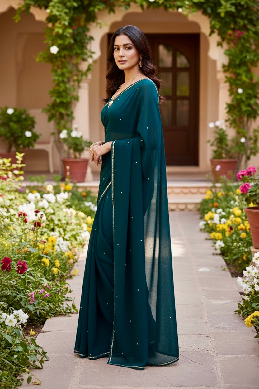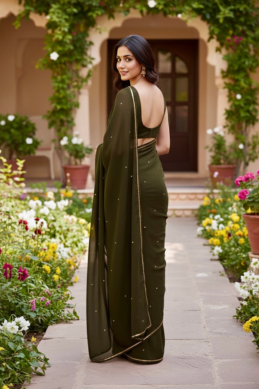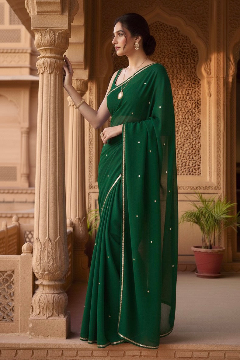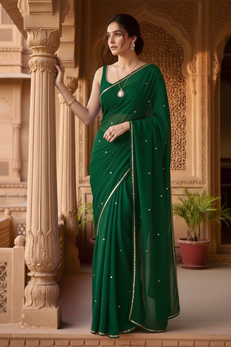 Celebrate the Indian craftsmanship with our 100% Pure Mulberry Silk Chiffon Saree. Handloomed and hand-dyed shades of Green to perfection, it features a soft, fluid drape with a subtle sequins spread and an elegant border.  Perfect for DIY enthusiasts and designers, this timeless saree invites creative customization—add laces, gota, or hand embroidery for a personalized touch, or wear it as-is for effortless sophistication.