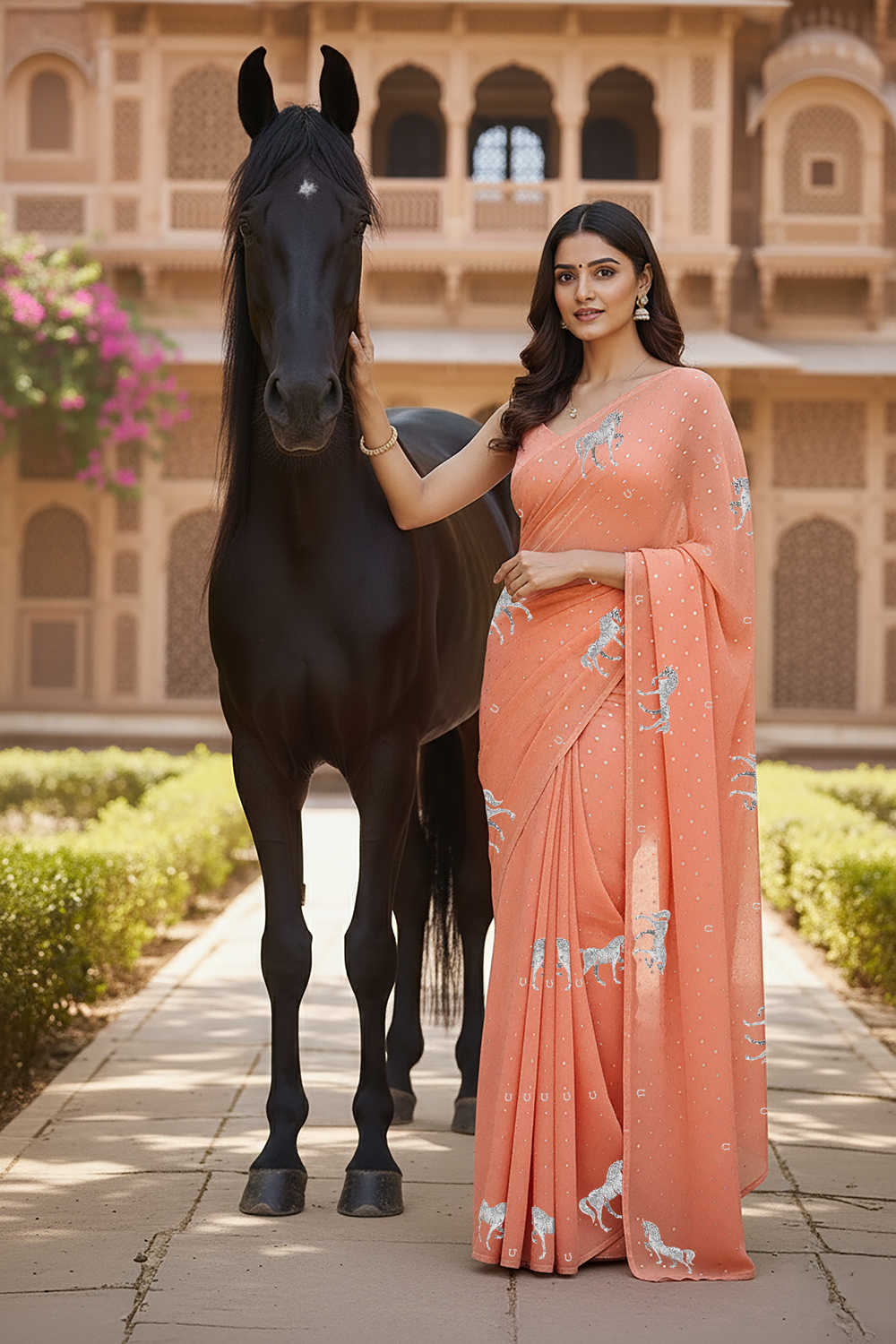 Celebrate the timeless bond! The Royal Canter pure Mulberry Silk Chiffon saree, adorned with sequin horse motifs crafted in the regal art of Aari-Tari embroidery. Horses — symbols of strength, loyalty, and grace — have long stood as noble companions, inspiring art, culture, and tradition. This saree captures that spirit, making it perfect for polo matches, race courses, horse shows, and elite social gatherings. Its lightweight drape and shimmering motifs reflect both heritage and luxury, offering a statement of elegance for those who cherish the bond and the grandeur of equestrian life.