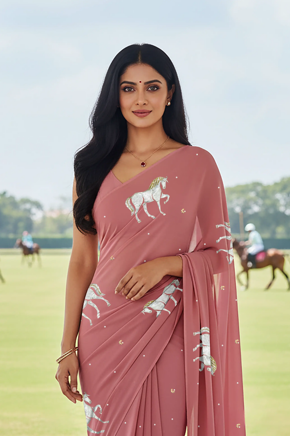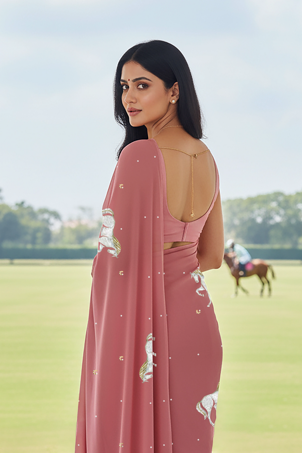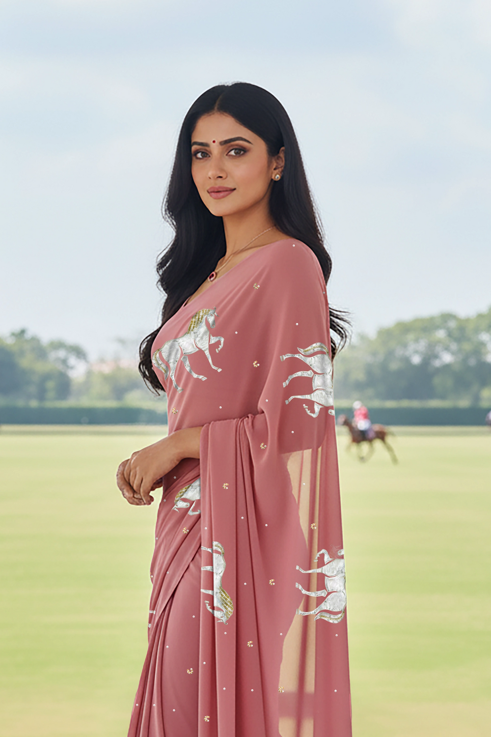 Celebrate the timeless bond! The Royal Canter pure Mulberry Silk Chiffon saree, adorned with sequin horse motifs crafted in the regal art of Gota Zardosi embroidery. Horses — symbols of strength, loyalty, and grace — have long stood as noble companions, inspiring art, culture, and tradition. This saree captures that spirit, making it perfect for polo matches, race courses, horse shows, and elite social gatherings. Its lightweight drape and shimmering motifs reflect both heritage and luxury, offering a statement of elegance for those who cherish the bond and the grandeur of equestrian life.