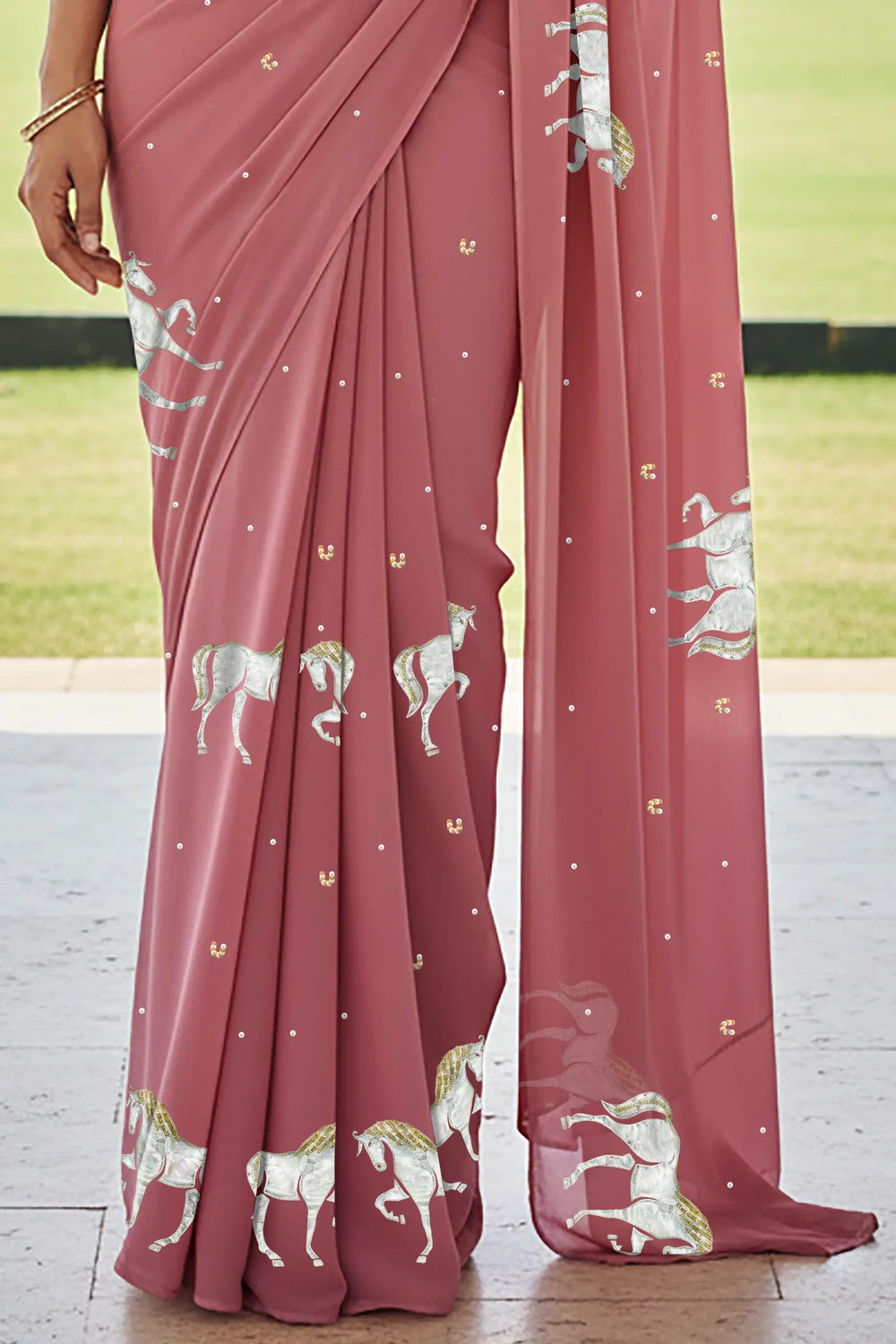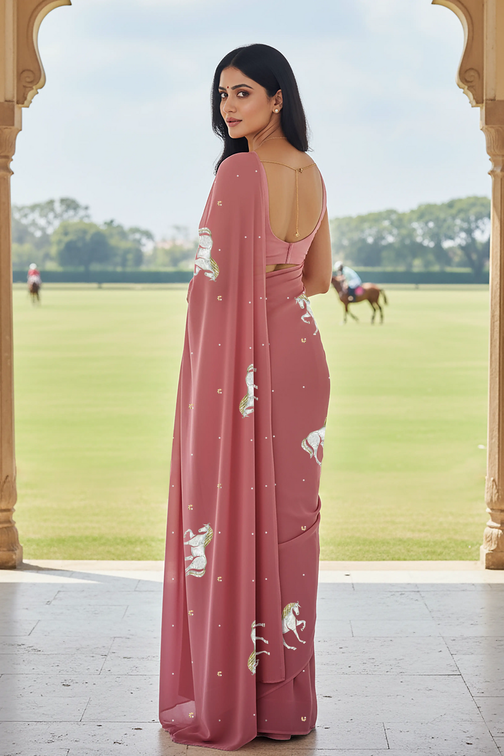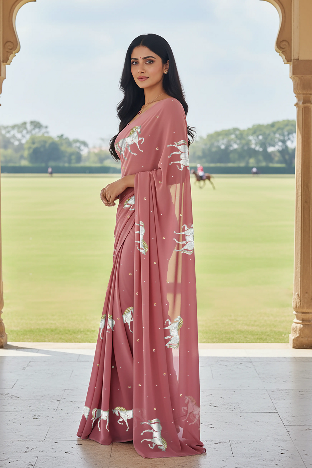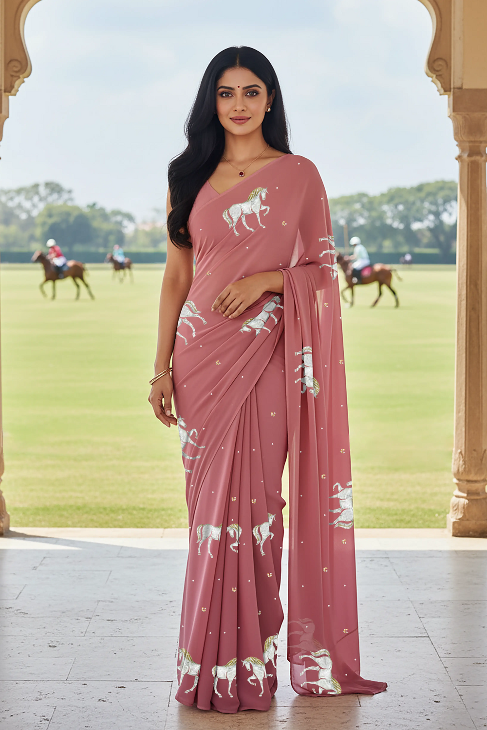 Celebrate the timeless bond! The Royal Canter pure Mulberry Silk Chiffon saree, adorned with sequin horse motifs crafted in the regal art of Gota Zardosi embroidery. Horses — symbols of strength, loyalty, and grace — have long stood as noble companions, inspiring art, culture, and tradition. This saree captures that spirit, making it perfect for polo matches, race courses, horse shows, and elite social gatherings. Its lightweight drape and shimmering motifs reflect both heritage and luxury, offering a statement of elegance for those who cherish the bond and the grandeur of equestrian life.