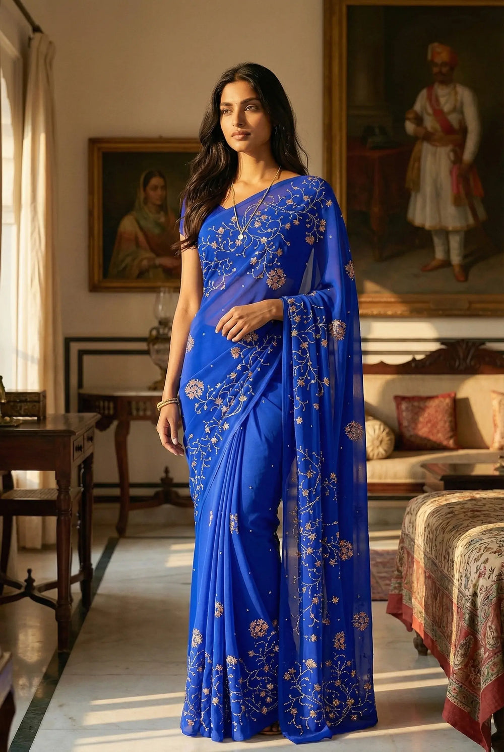 An Indian woman standing in a minimal white courtyard wearing a royal blue chiffon saree embellished with vgolden sliver and pink sequin vines of Stylized Jasmine by Umaid Couture.